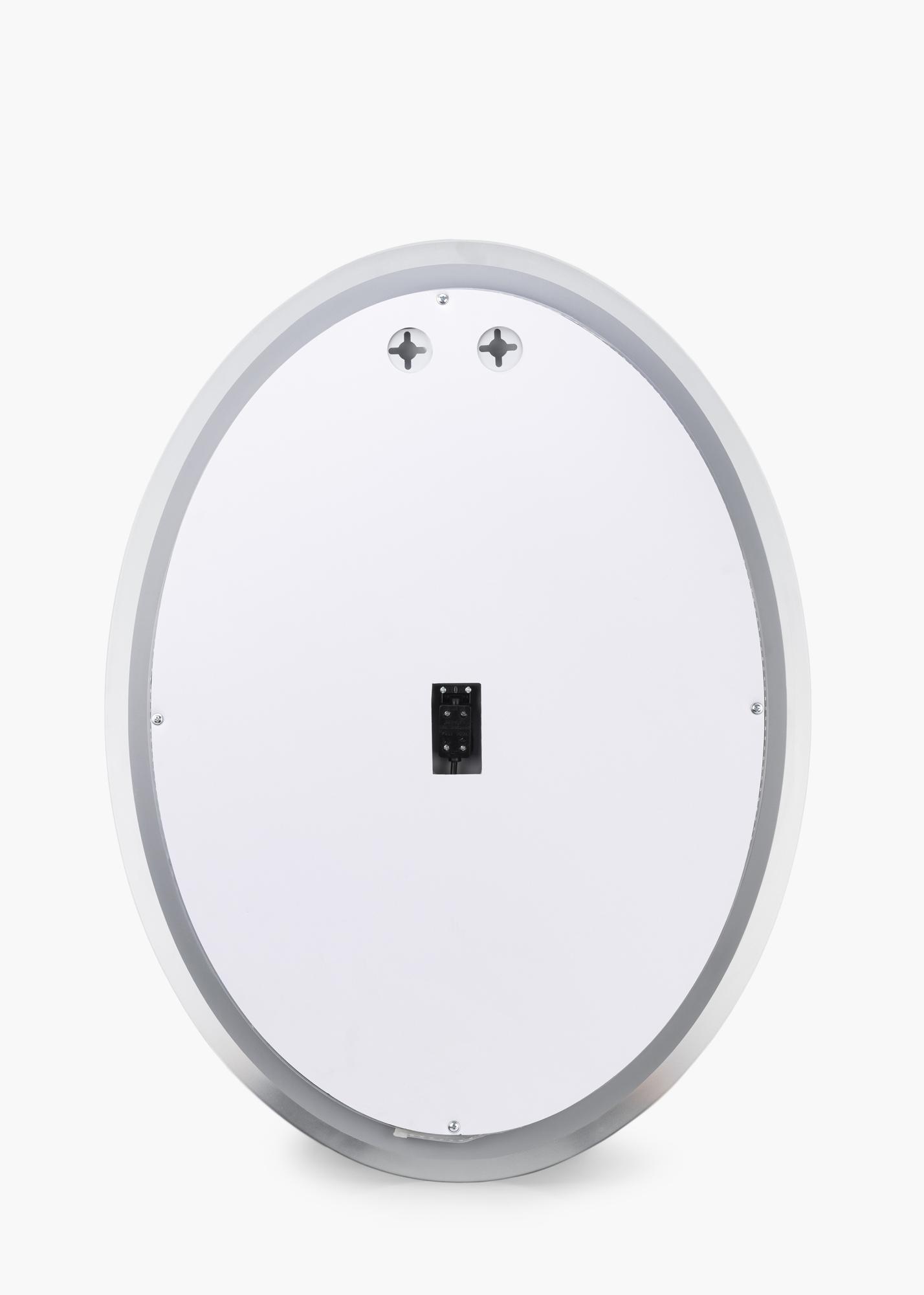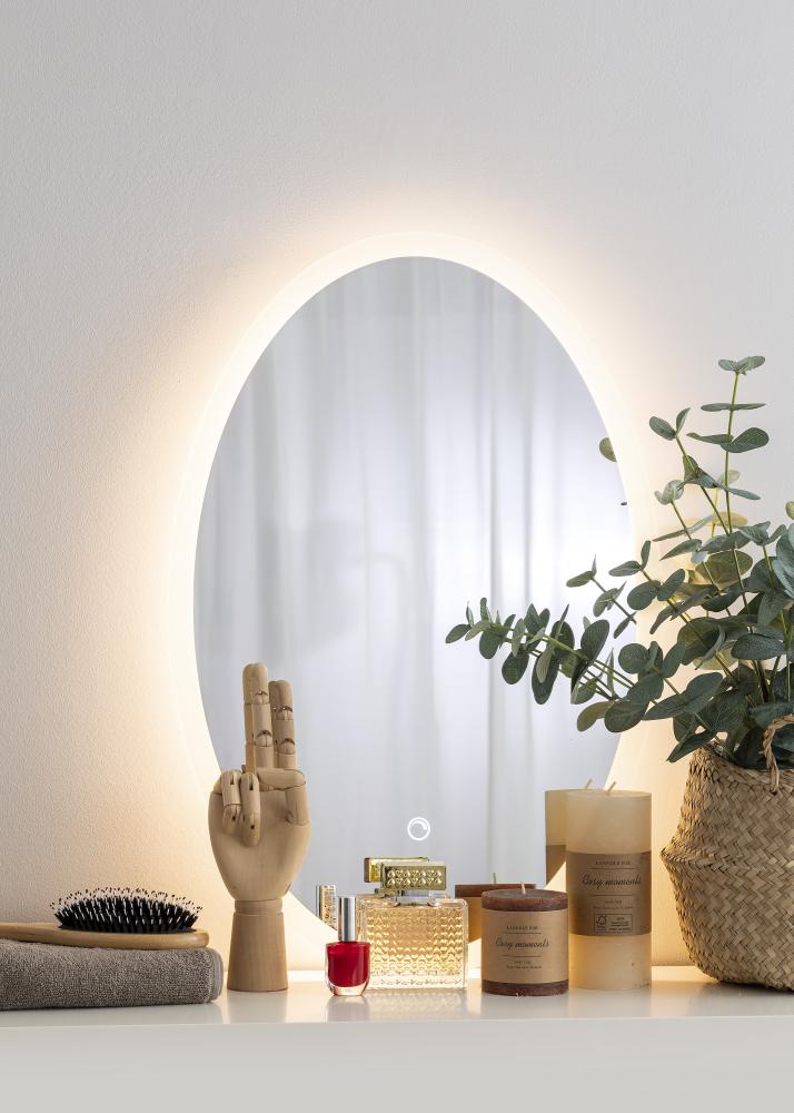 Това наистина е баня с огледало в елегантен дизайн с овала форма и интегрирано LED осветление! Интегрираното LED осветление е регулируемо и силата му се настройва лесно чрез натискане на водоустойчивия сензорен бутон на екрана. Осветлението свети в топло бял нюанс на 3000K зад огледалото и дава приятно осветление напред. LED е енергоспестяващ източник на светлина, който предлага равномерно и естествено осветление. Огледалото е одобрено за баня. Огледалото за баня е предназначено за постоянна инсталация и се свързва към ключ. За да функционира правилно, огледалото трябва да се свърже към обикновен ключ, не към димер ключ.