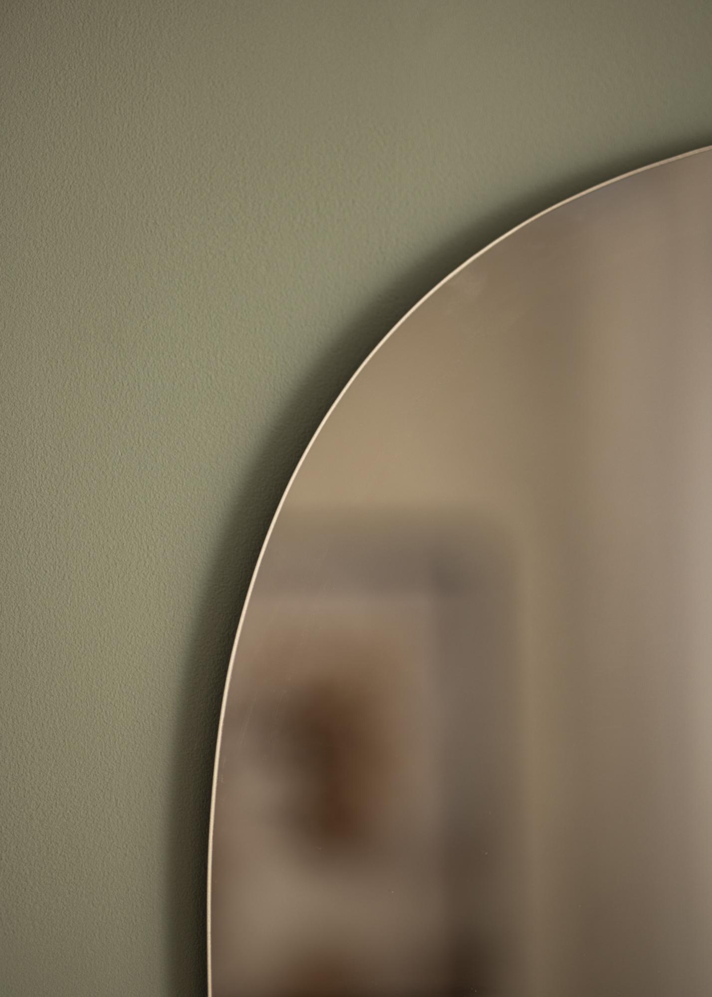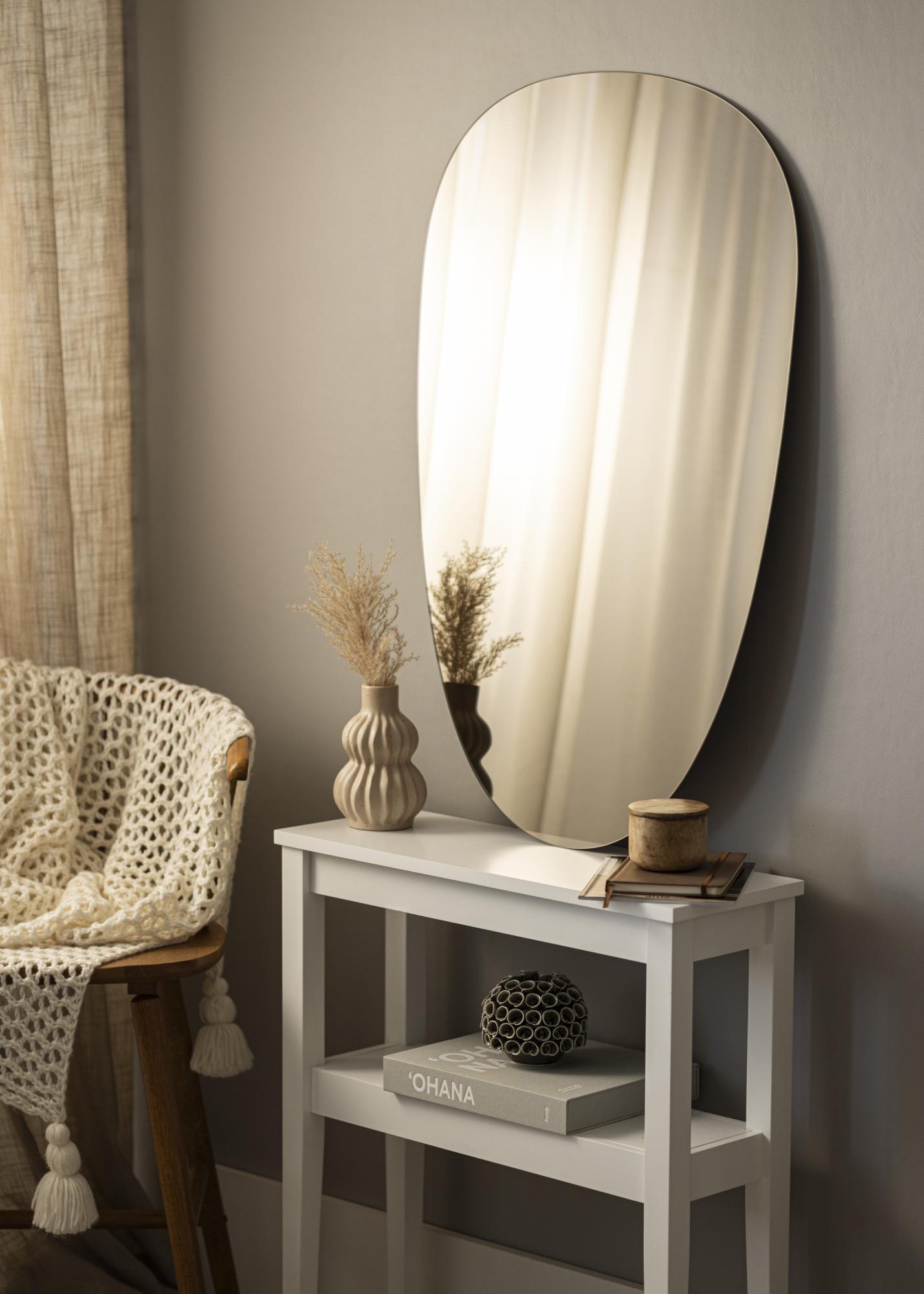 Това е асиметрично огледало с меки форми и много елегантен и модерен външен вид. Огледалното стъкло е тонирано в стилен нюанс на тъмна бронз, което го прави ефектен интериорен детайл, който лесно се съчетава с много различни цветови схеми на интериора. Огледалото също е много тънко и няма рамка, което допълнително подсилва изисканото и модерно усещане. Поставете огледалото в коридора, хола, спалнята – или във всяка стая, където искате да добавите функционалност и елегантен шведски дизайн!