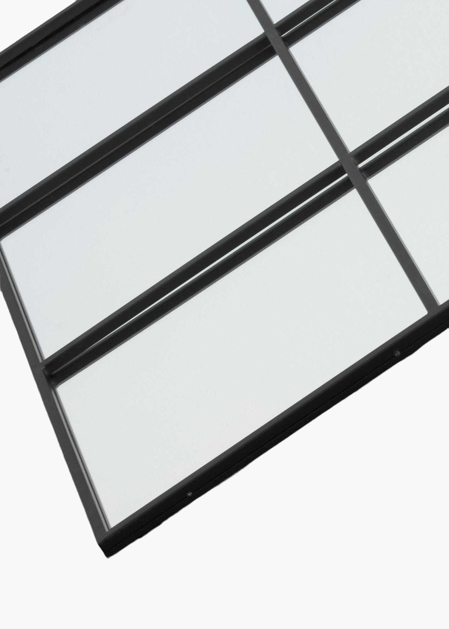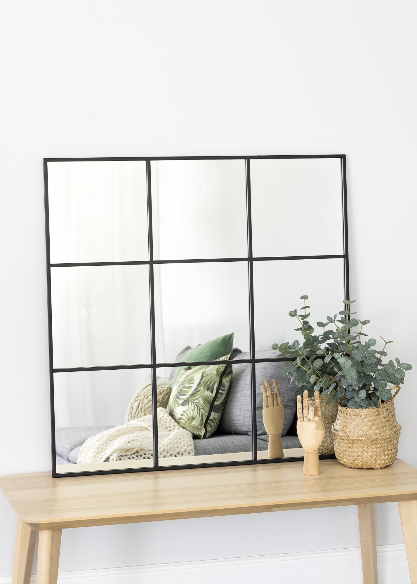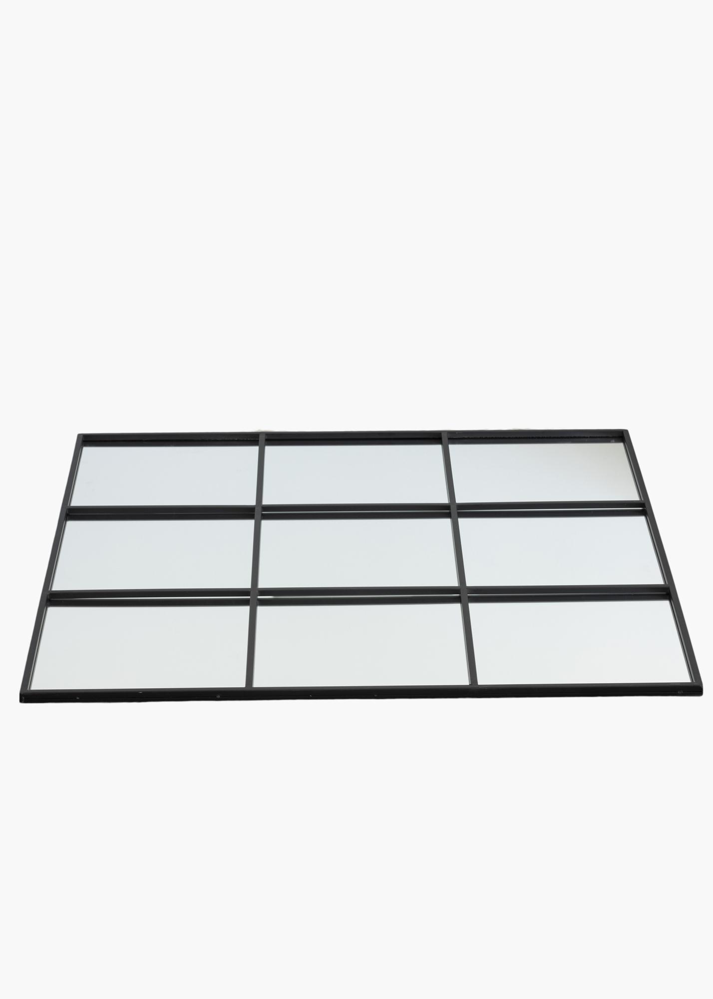 Това е огледало с квадратна форма и стилен решетъчен дизайн. Квадратите са стилно оградени с тънки черни линии от метал, които придават на това стенално огледало рустикален и индустриален характер. Квадратната форма прави огледалото да има по-изчистен вид. Поставете това огледало например в коридора, кухнята или спалнята, за да създадете повече пространство в стаята и същевременно да получите декоративен интериорен детайл. Има крепеж за стена. Огледалото е с размери 90x90 см.