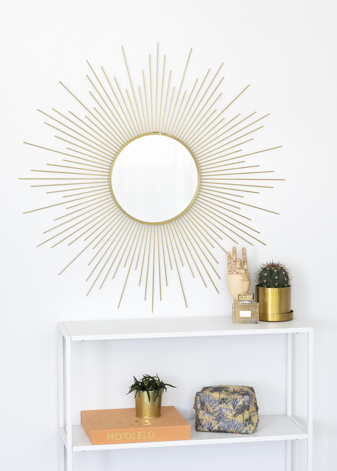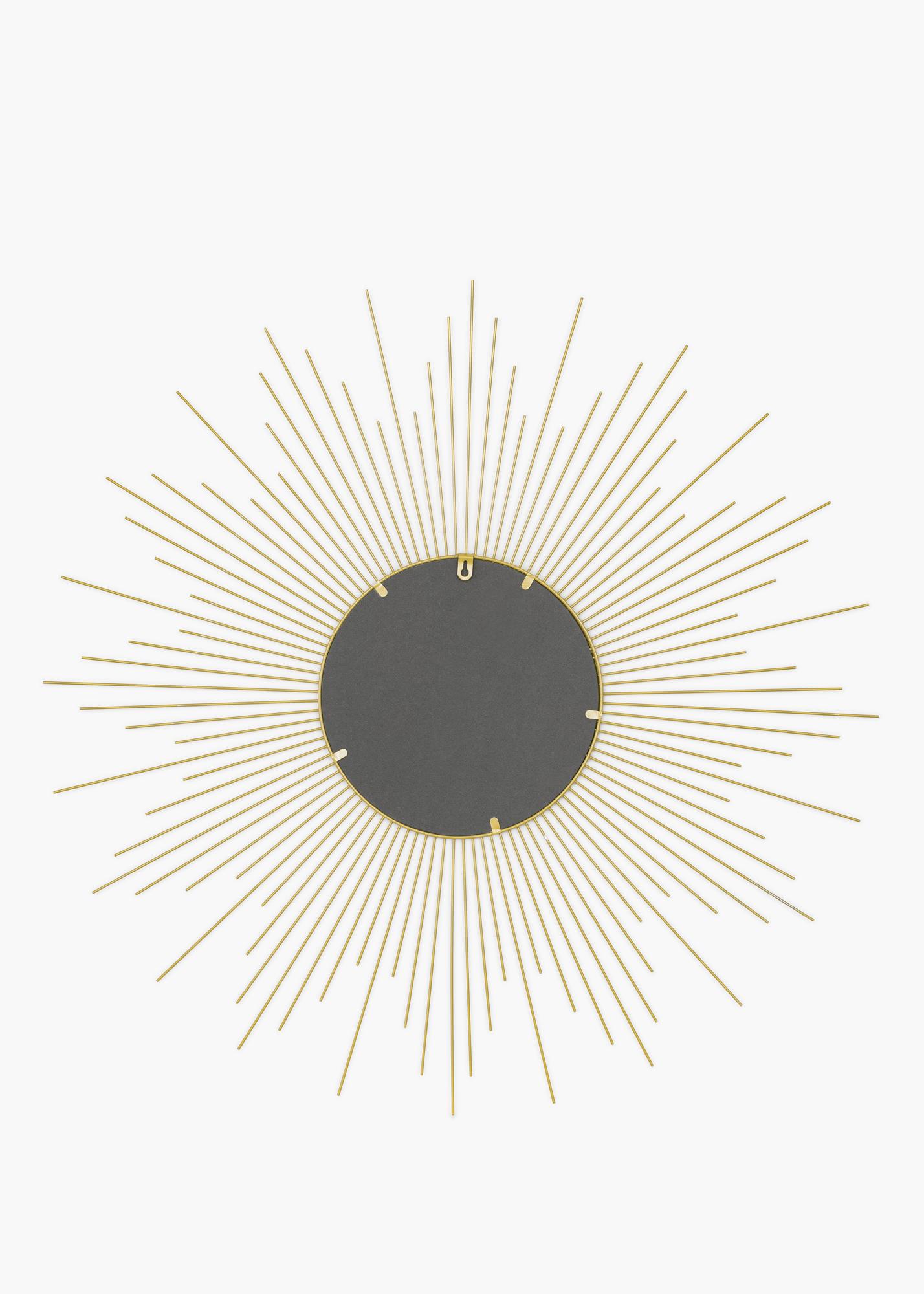 Това е кръгло стеннo огледало с много декоративен дизайн. Огледалното стъкло е оградено с шарка, която напомня звезда и е в красива златиста нюанс. Поставете този красив огледало в дома си на добре избрано място, където да може да се разкрие с цялата си декоративна прелест и да се превърне в впечатляващ елемент на интериора. Огледалото има размери 90x90 см и е изработено от метал.