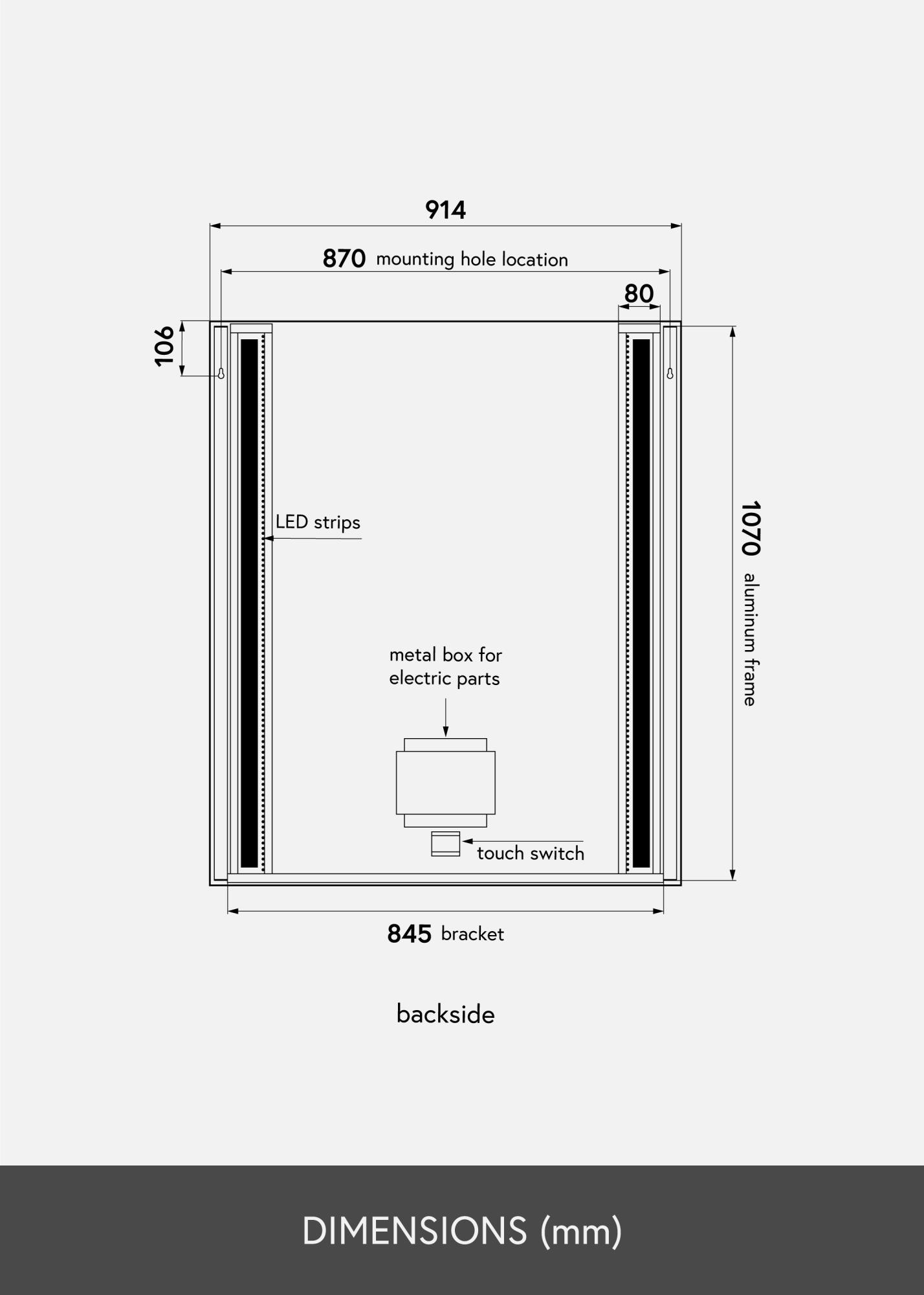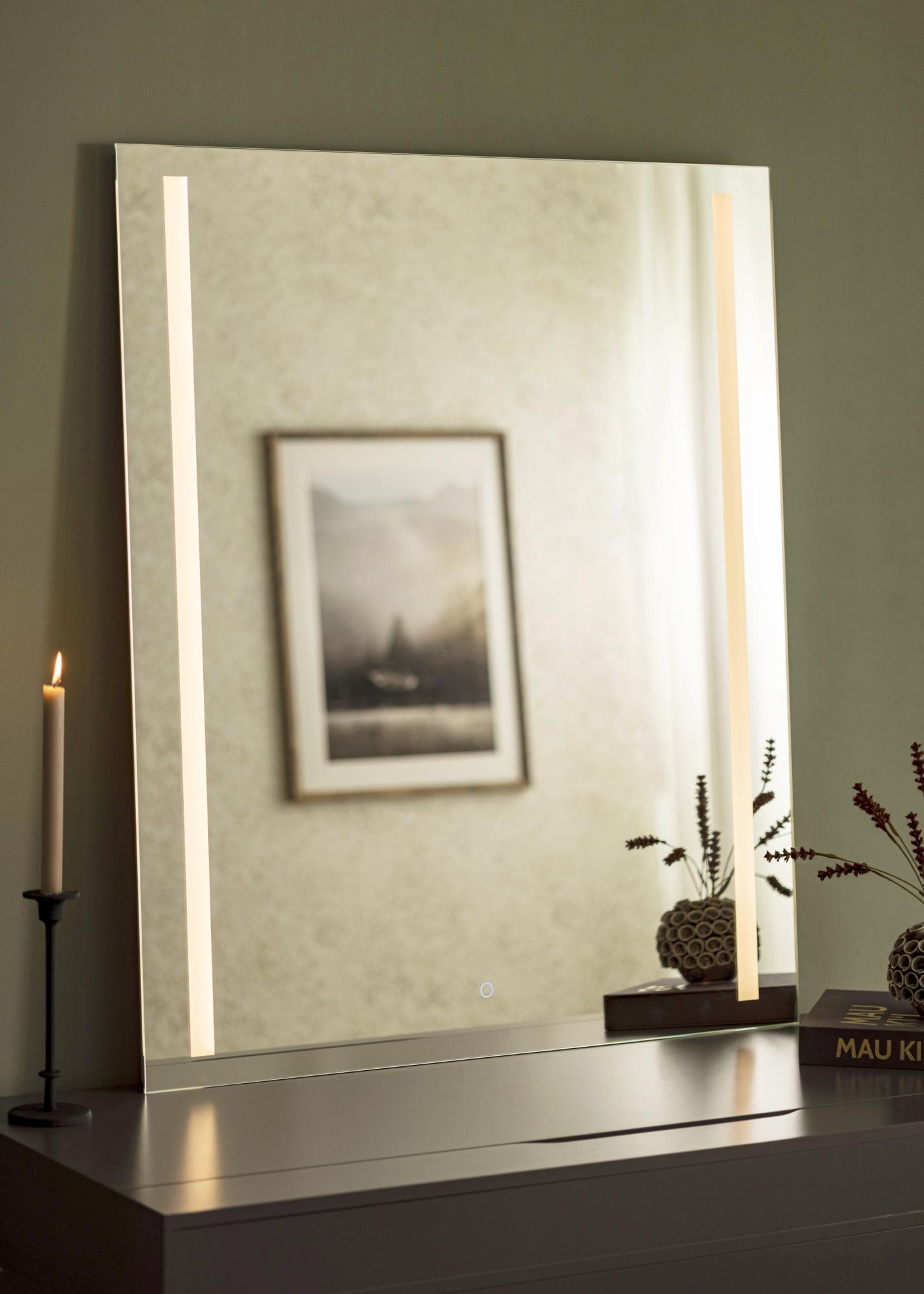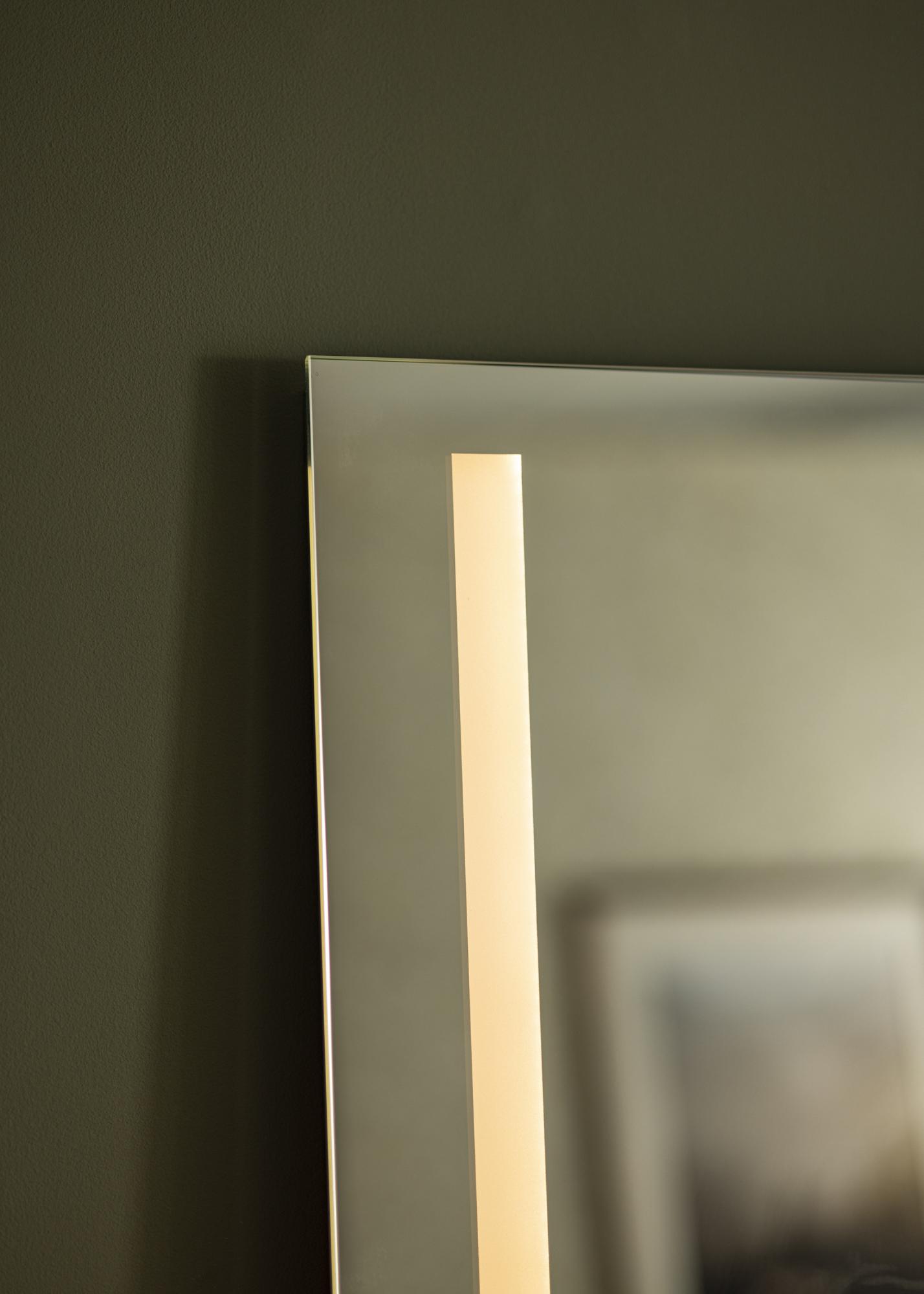 Това е елегантно огледало за баня с осветление и класическа правоъгълна форма. Осветлението се състои от две LED ленти, които са разположени малко навътре върху повърхността на огледалото. Това придава стилен минималистичен израз, който отлично пасва в банята. LED осветлението осигурява приятно сияние в 3000K и за ваше удобство можете лесно да димирате осветлението, като задържите touch бутона в долния край на огледалото. Така можете да настроите 10-100% от яркостта. Огледалото е предназначено за фиксирана инсталация и се свързва с ключ. За да работи огледалото правилно, трябва да се свърже с обикновен ключ, не с димерен ключ.