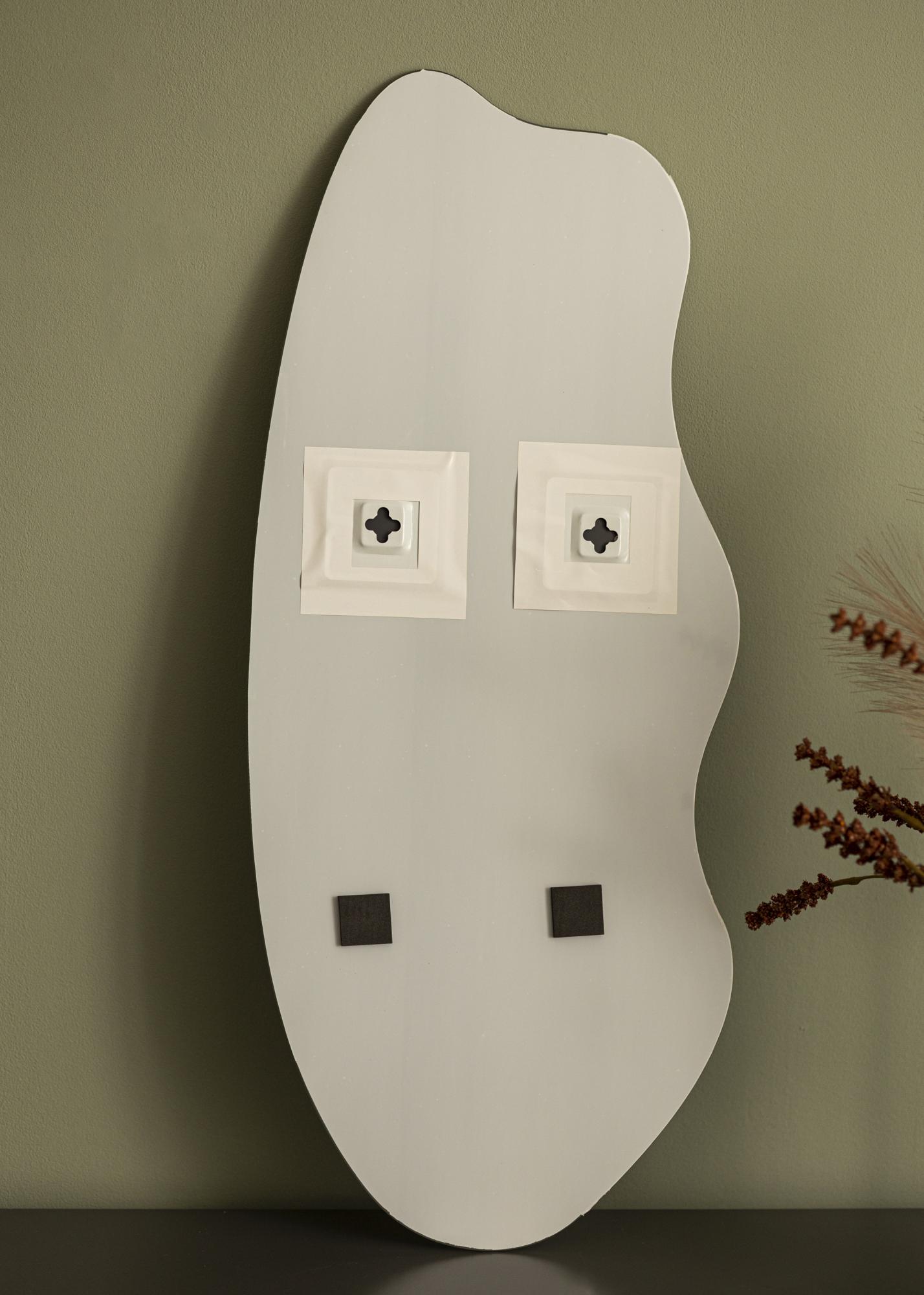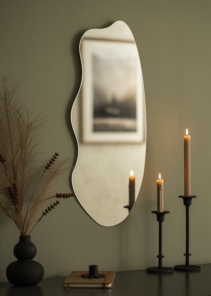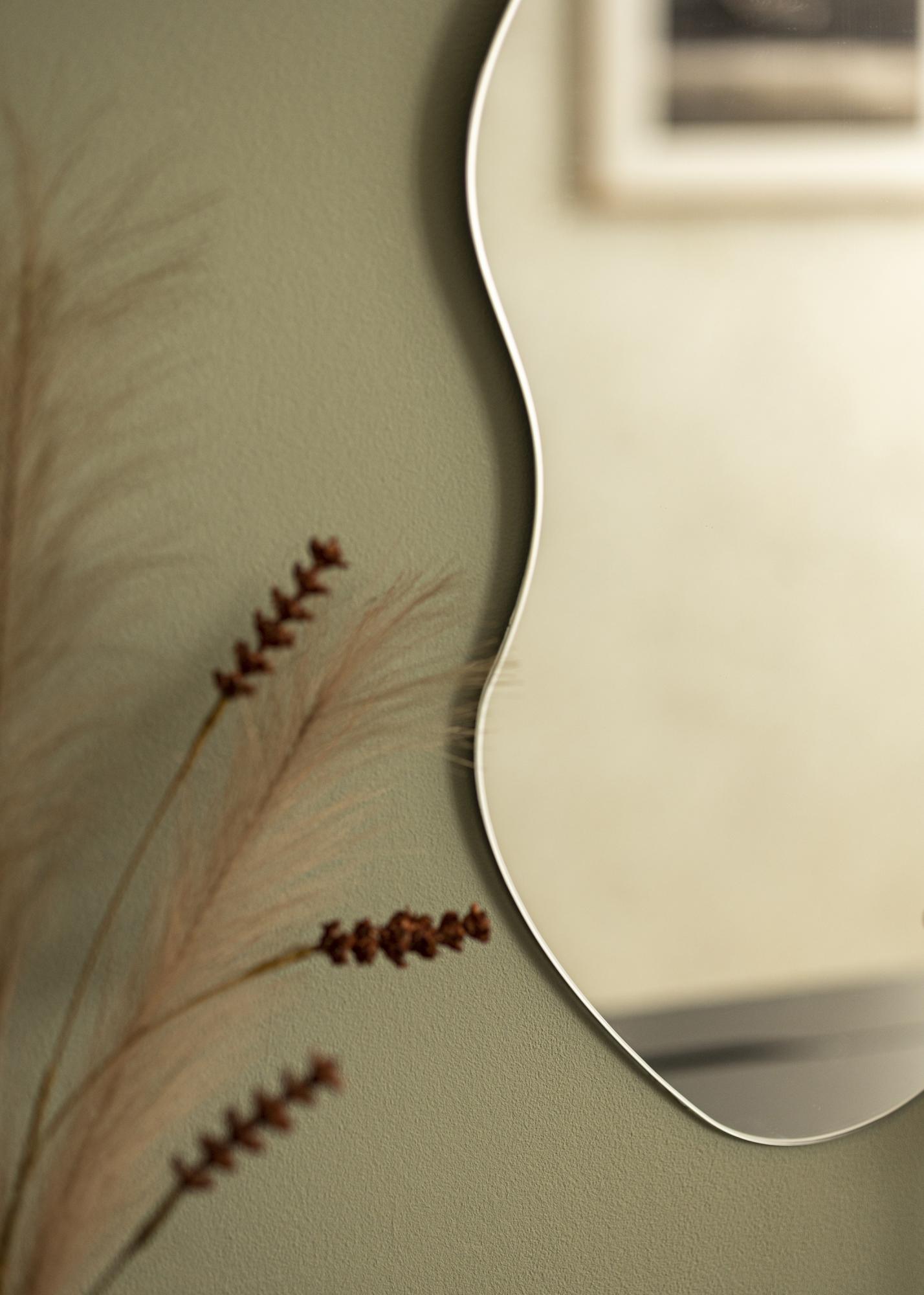 Асиметричното стенописало се превръща в забележителен елемент във всяка декорация на дома. Това огледало има уникална форма, където едната дълга страна е закръглена, а другата има вълнообразна форма. Заедно те образуват вълнуващо и елегантно цяло. Огледалото е подходящо както за антре, така и за хол, и може да служи като модерно огледало за баня.