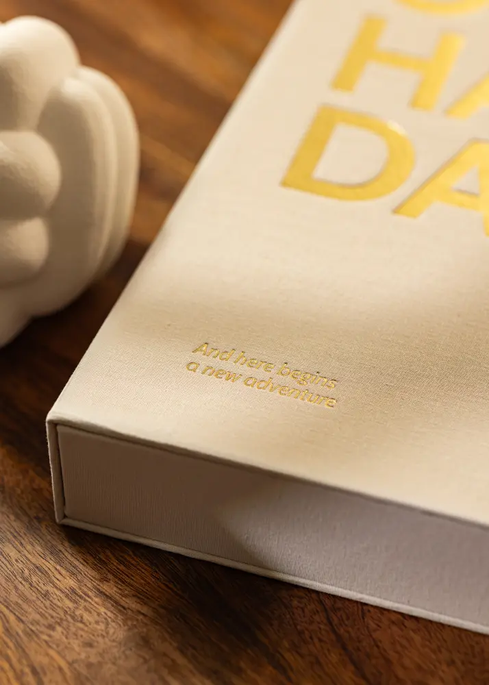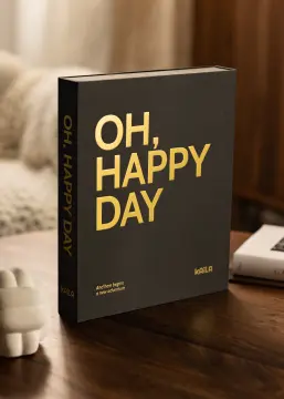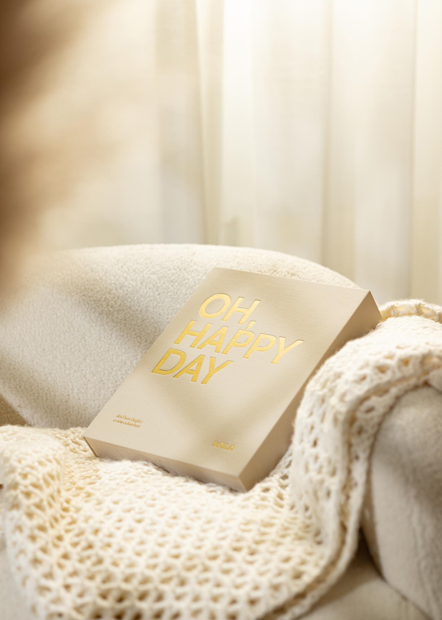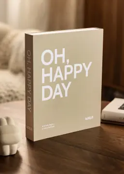 Тук е идеалният фотоалбум за вашите най-щастливи спомени от KAILA! Съхранявайте ги със стил в леко Coffee Table Photo Album, което същевременно става и елегантен елемент от декора на вашия дом. Този албум има заглавие "OH, HAPPY DAY", отпечатано на предната страна с големи бели букви и подзаглавие "И тук започва ново приключение".