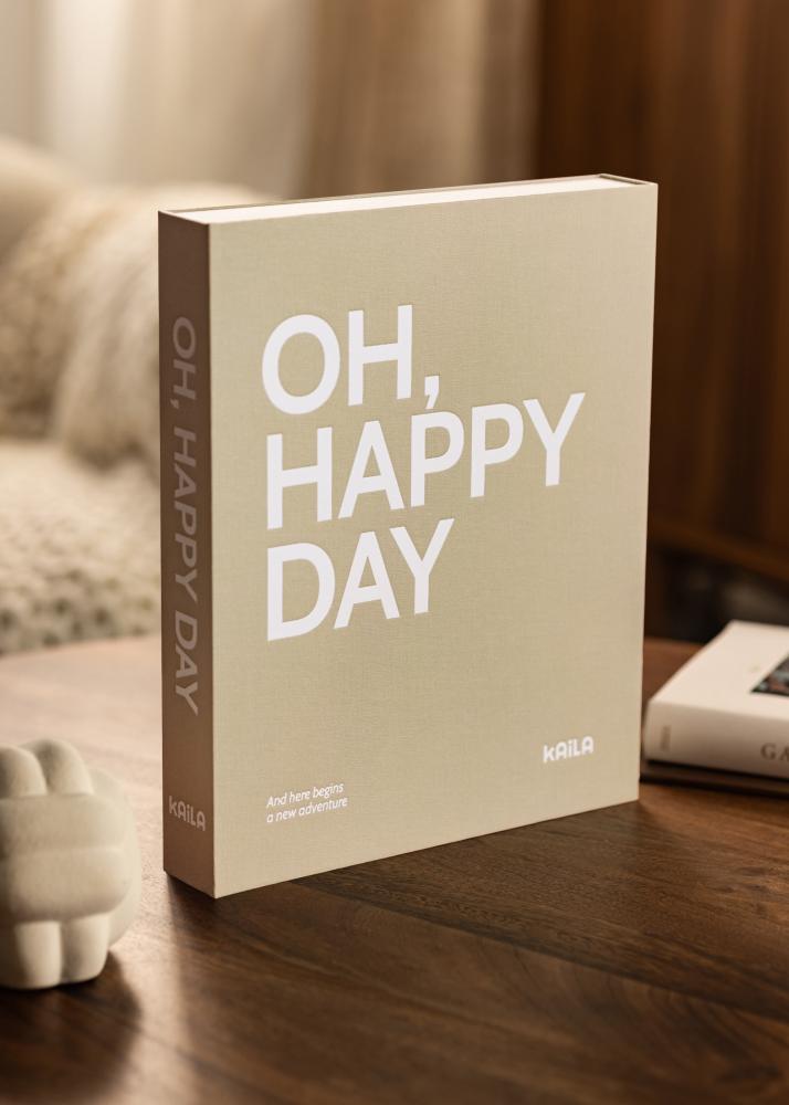 Тук е перфектният фотоалбум за вашите най-щастливи спомени от KAILA! Съхранявайте ги стилно в текстилно леко Coffee Table Photo Album, което едновременно става стилен аксесоар за дома ви. Този албум има заглавие „OH, HAPPY DAY“ отпечатано на предната корица с големи бели букви и подзаглавие „И тук започва ново приключение“.