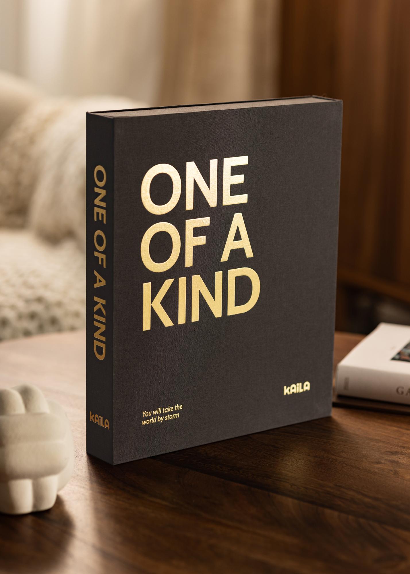 Проявете вашите снимки и ги съхранявайте в красив фотоалбум за масичка за кафе! Този фотоалбум от KAILA е облечен в черен текстил и е проектиран като луксозна кутия, което наистина му придава изключително усещане. Най-хубавото е, че този фотоалбум е също толкова стилен като интериорен детайл! На предната корица на фотоалбума е отпечатано заглавието „ONE OF A KIND“ с големи бели букви и подзаглавието „You will take the world by storm“, което прави този албум перфектен за красиви снимки от детството или за подарък на някой специален, или разбира се, за вашите собствени прекрасни фотоспомени.