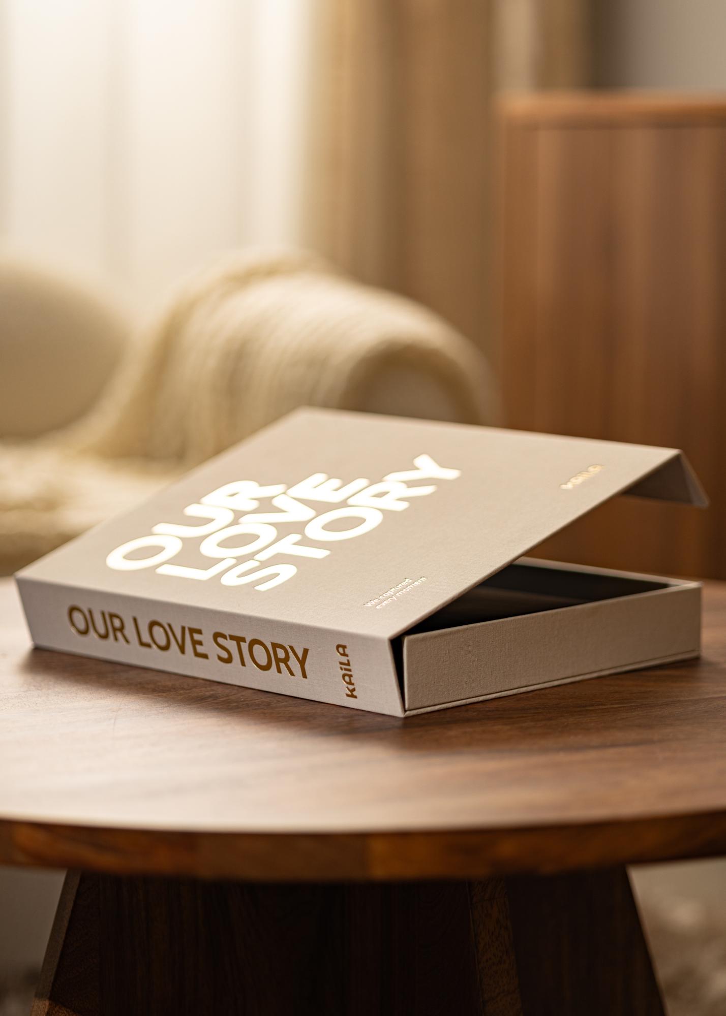 Това е фотоалбум и книга за кафе-маса, комбинирани в едно, които едновременно се превръщат в декоративен елемент в дома ви. Фотоалбумът е проектиран като текстилна кутия и е в красиво кремаво. На предната страна на фотоалбума е отпечатано заглавието „OUR LOVE STORY“ с големи бели букви и подзаглавие „We captured every moment“, което прави този албум идеален за запазване на красиви спомени от най-скъпите ви взаимоотношения или за подарък. Защо не запазите красиви сватбени снимки в този елегантен фотоалбум? От вътрешната страна на фотоалбума има дискретен отпечатан модел и рингова папка с 30 (60 страници) черни листа, където можете да залепите вашите снимки, което ви дава възможност да бъдете креативни.