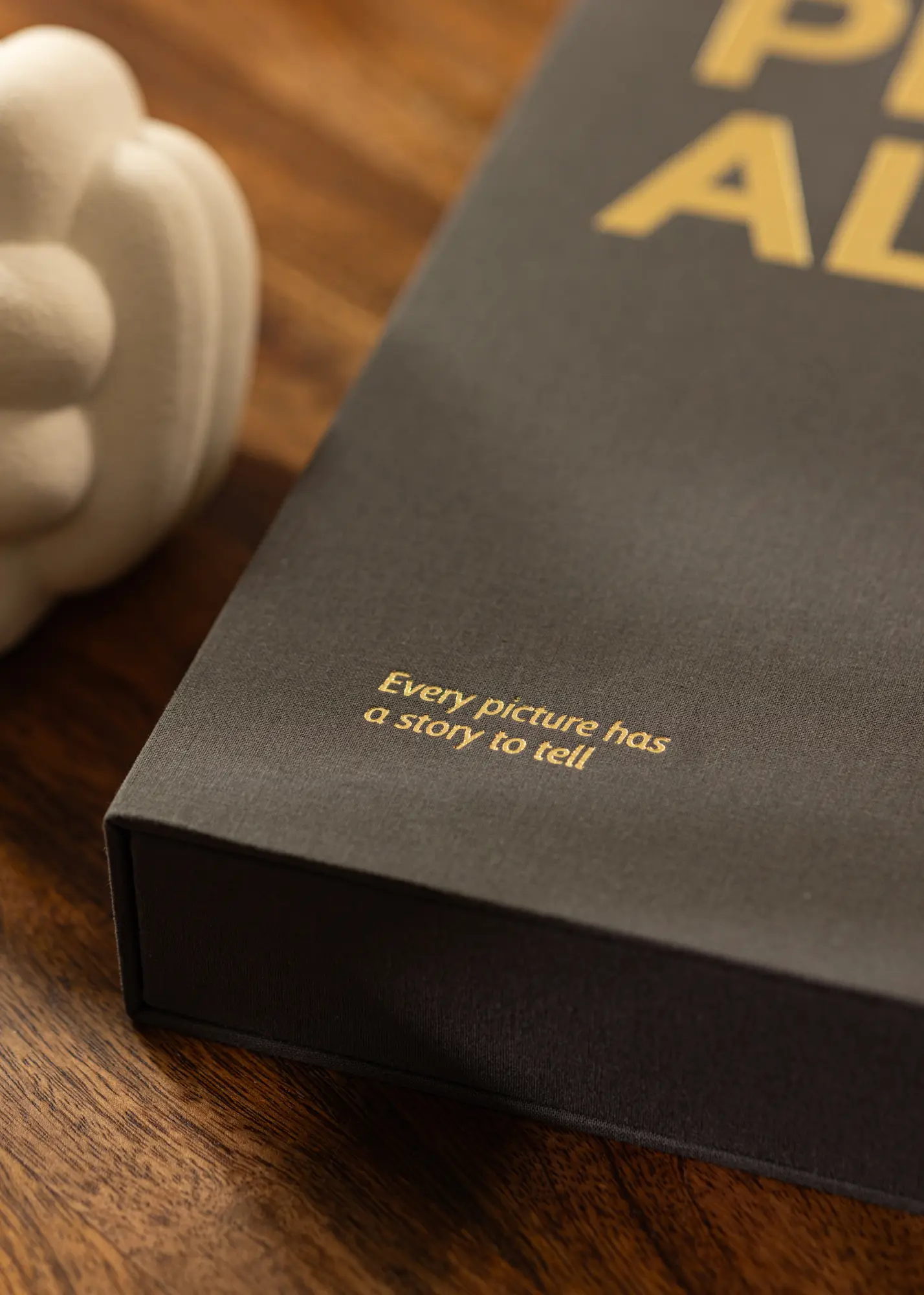 Това е фотоалбумът за вас, ако търсите албум, който да побере вашите най-хубави фотоспомени и едновременно с това е стилен и подходящ за излагане. Албумът е проектиран като книга за кафе, с модерен дизайн, който е лесна украса за холната маса или библиотеката. Той е проектиран като изключителна кутия с корица от изчистен черен текстил. Когато отворите албума, ще срещнете рингова папка с 60 черни албума страници (30 листа), които можете да запълните със снимки от красиви моменти. Вие сами поставяте снимките точно там, където искате.