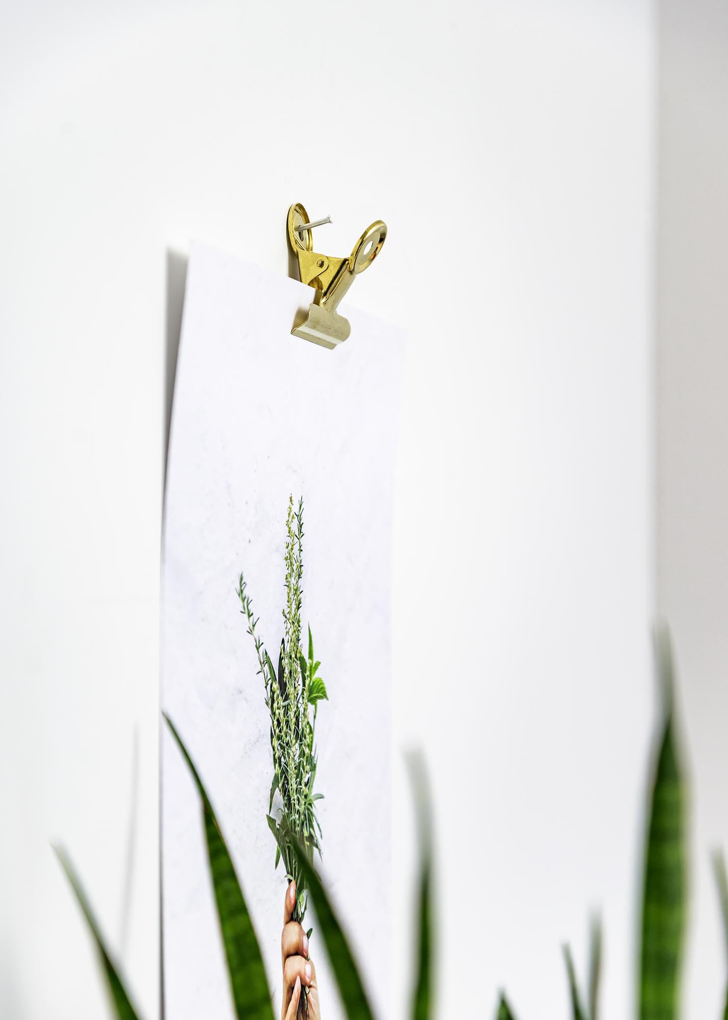 Метална щипка в елегантно и блестящо златисто покритие, което придава на вашите постери и щампи модерен и минималистичен начин на окачване. Дизайнът на постерната щипка е стилен, а отворите в кръглия връх на щипката улесняват закрепването й на стената с малък пирон или винт. Отварянето на щипката има здраво захващане, което позволява да окачите най-тънката хартия, като същевременно е гъвкавa и позволява монтирането на мотиви с различна дебелина. Ако имате голям постер, който искате да окачите, използвайте две метални щипки за най-добър резултат.