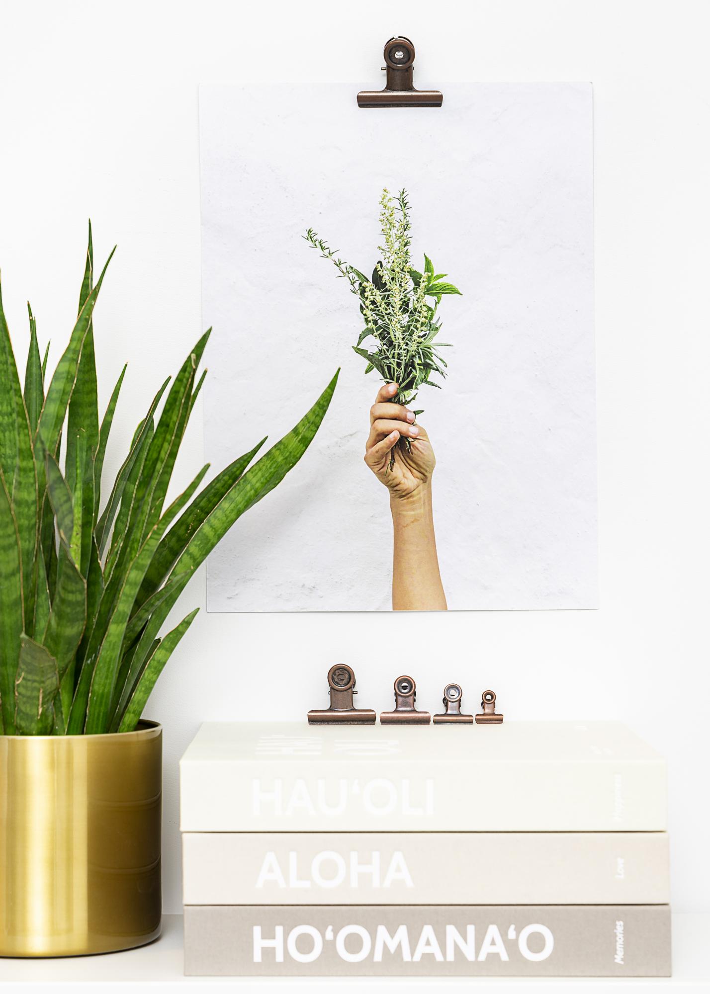 Това е метална щипка в рустик стил с красиво изтъркана месинг, която ви осигурява модерен начин за окачване на постери или принтове. Монтажът на вашата стена също е много лесен благодарение на отворите в елегантната кръгла горна част на щипката. Отворът на щипката предоставя гъвкав, но здрав захват, който ви позволява да монтирате както тънка хартия, така и постери с малко по-голяма дебелина, а ако искате да окачите голям постер, винаги можете да използвате две метални щипки.