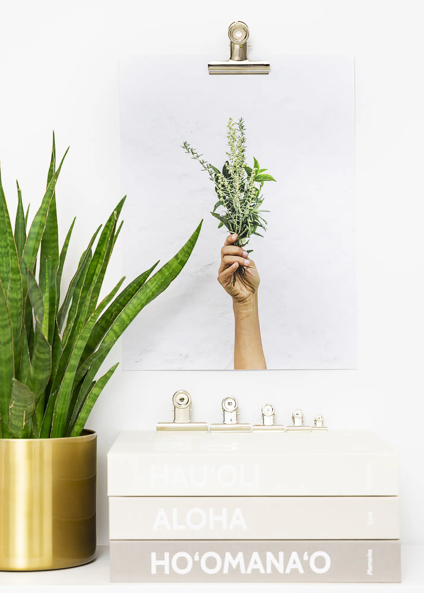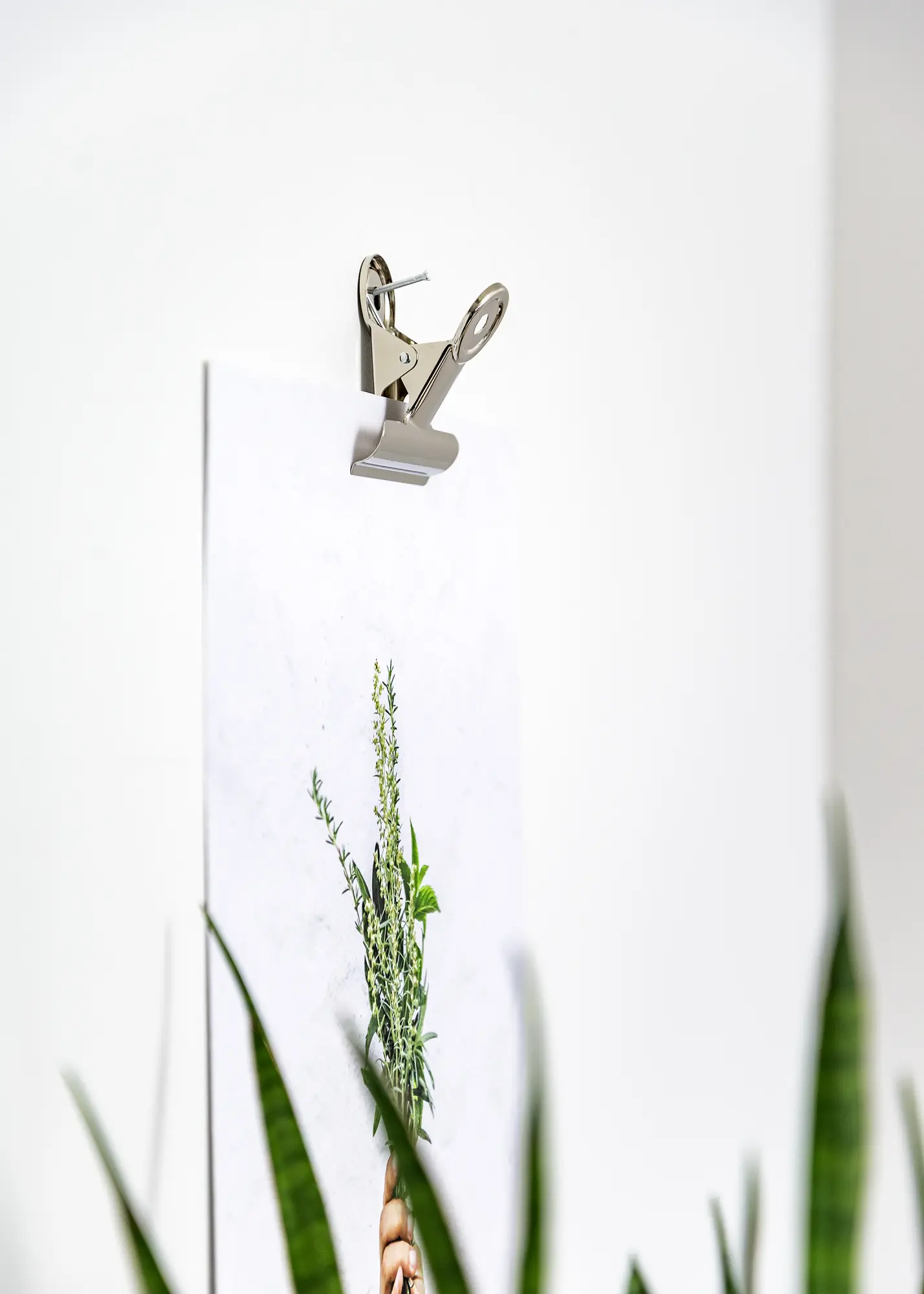 Тази метална щипка има модерен и лъскав сребърен завършек и е перфектният инструмент за създаване на тенденциозно и минималистично окачване на постери или принтове. Гъвкавото и здраво отваряне на щипката позволява да закачите мотиви с различна дебелина, дори най-тънката хартия. Ако имате голям постер, просто използвайте две метални щипки. Дизайнът на щипката за постери е изчистен и стилен, а дупките в кръглия връх на щипката правят монтирането на стената лесно и бързо – всичко, от което се нуждаете, е малък пирон или винт.