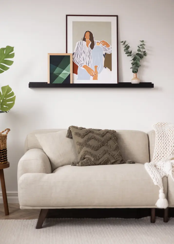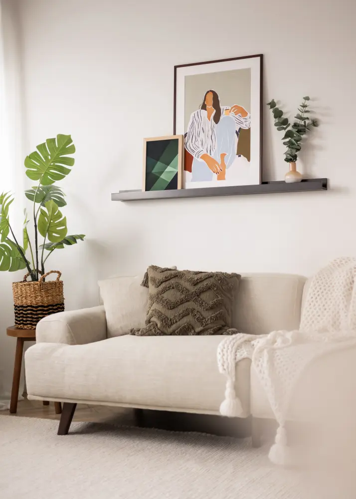 Показвайте и сменяйте стенните си картини лесно и стилно с елегантна полица за картини! Тази полица за картини е изработена от MDF и е модерно боядисана в черно с красива, полугланцова повърхност. Поставката за картини има стилен дизайн с прави, прости линии и минималистично усещане. Рафтовата плоскост има вдлъбнатина в средата, която служи като опора за картините ви и им придава красив ъгъл, когато са наклонени към стената.