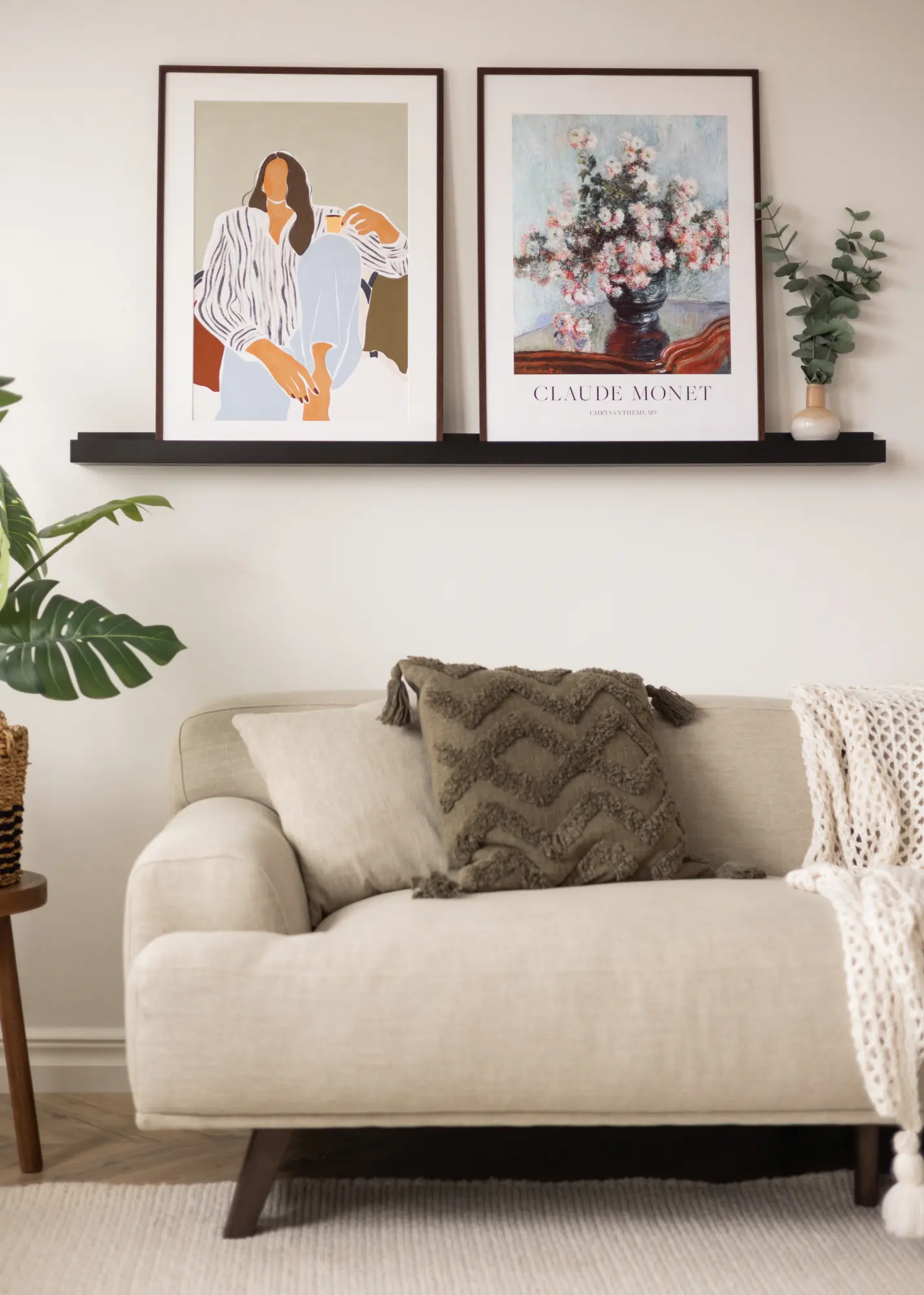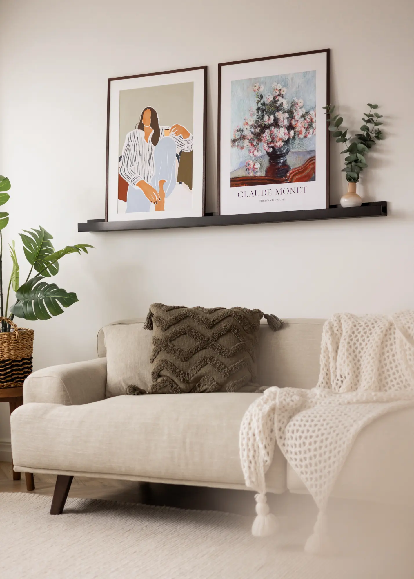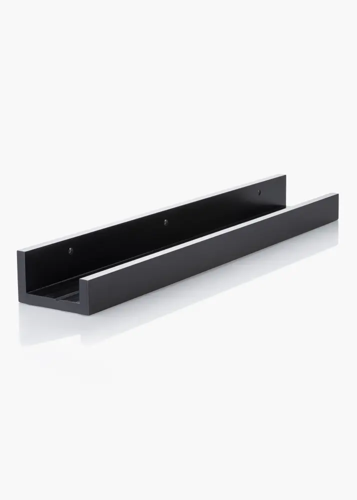 Показвайте и променявайте вашето стенна изкуство лесно и стилно с елегантна рафтче за картини! Това рафтче за картини е изработено от MDF и е модерно боядисано в черно с красива, полу-гланцова повърхност. С рафтчето има изчистен дизайн с прави, прости линии и минималистично усещане. Рафтът има изрязана улей в средата, която служи като опора за вашите картини и им дава красив ъгъл, при който те стоят наклонени към стената.