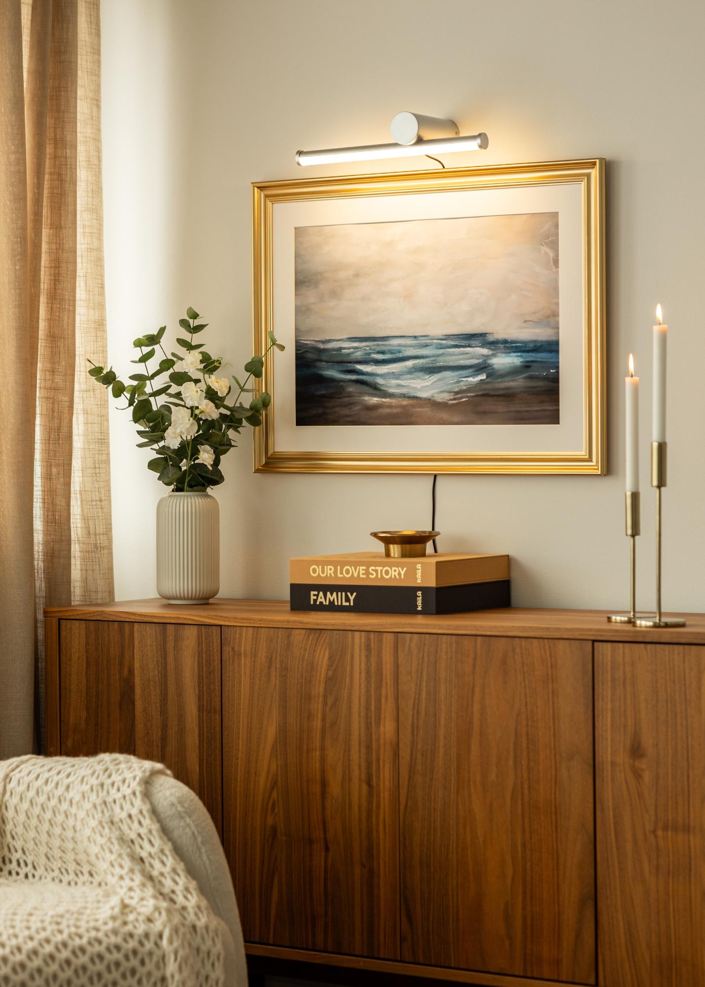 С цветова температура от 3000K това осветление предоставя топла, но все пак естествена светлина, която подчертава детайлите на вашите произведения на изкуството, без да е натрапчива. Интегрираният LED източник на светлина има яркост от 520 лумена, което осигурява достатъчно светлина, за да покрие картини до 80 см ширина, като същевременно потреблението на енергия остава ниско благодарение на модерната LED технология.