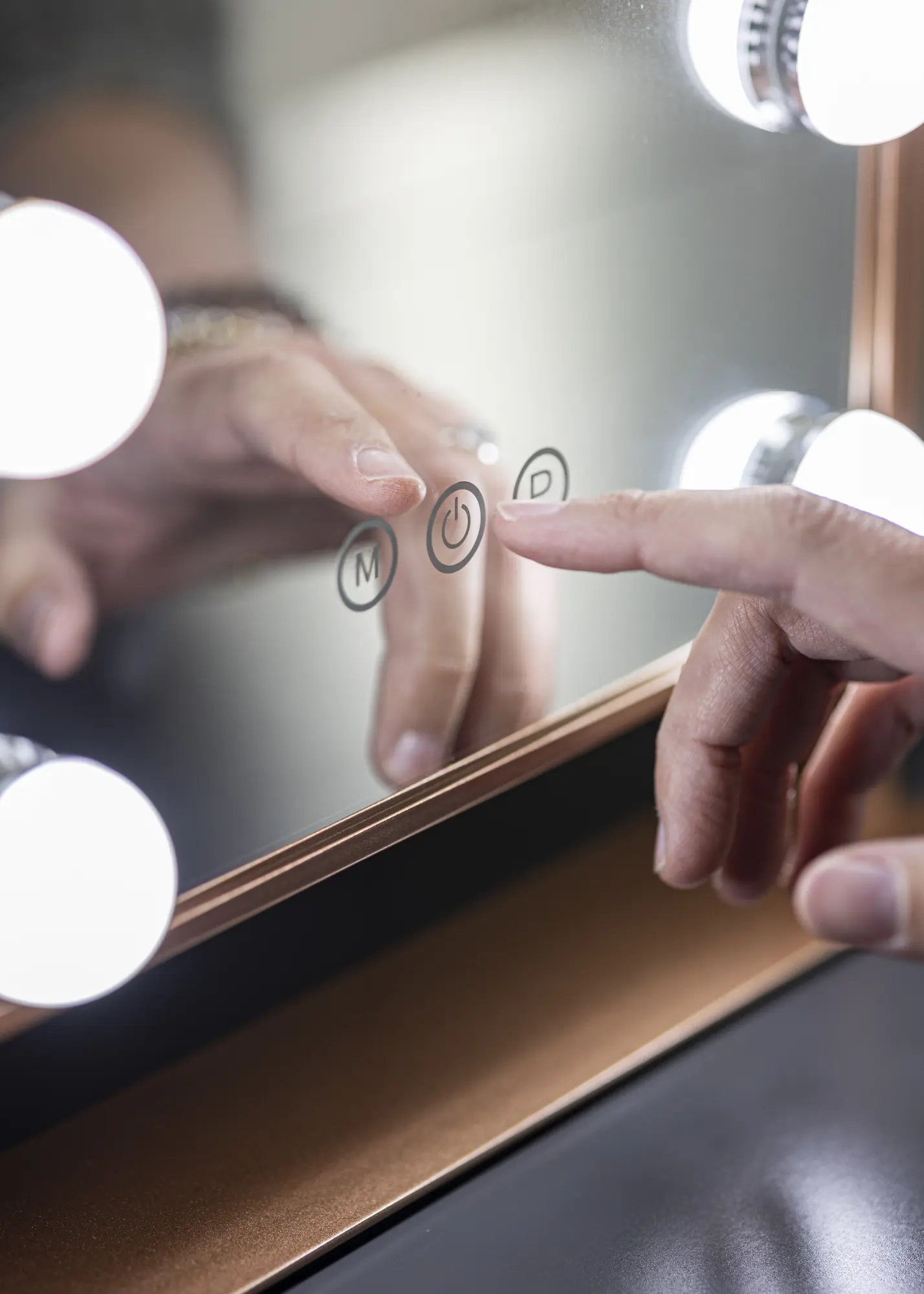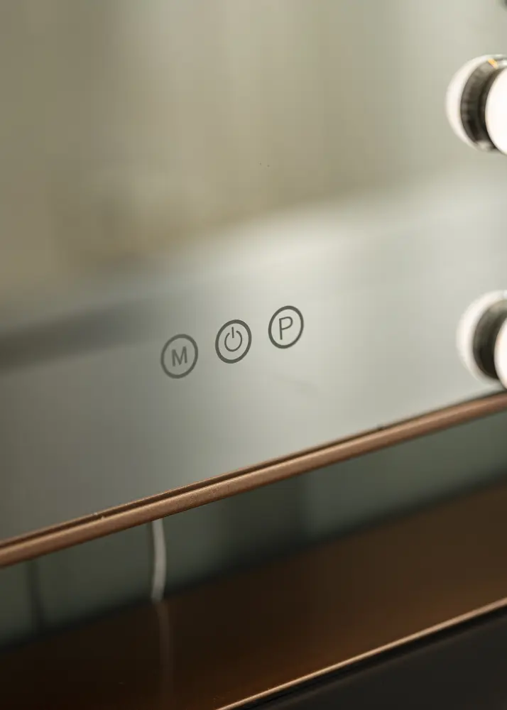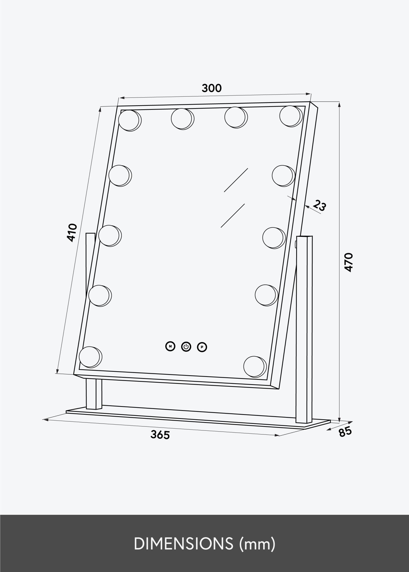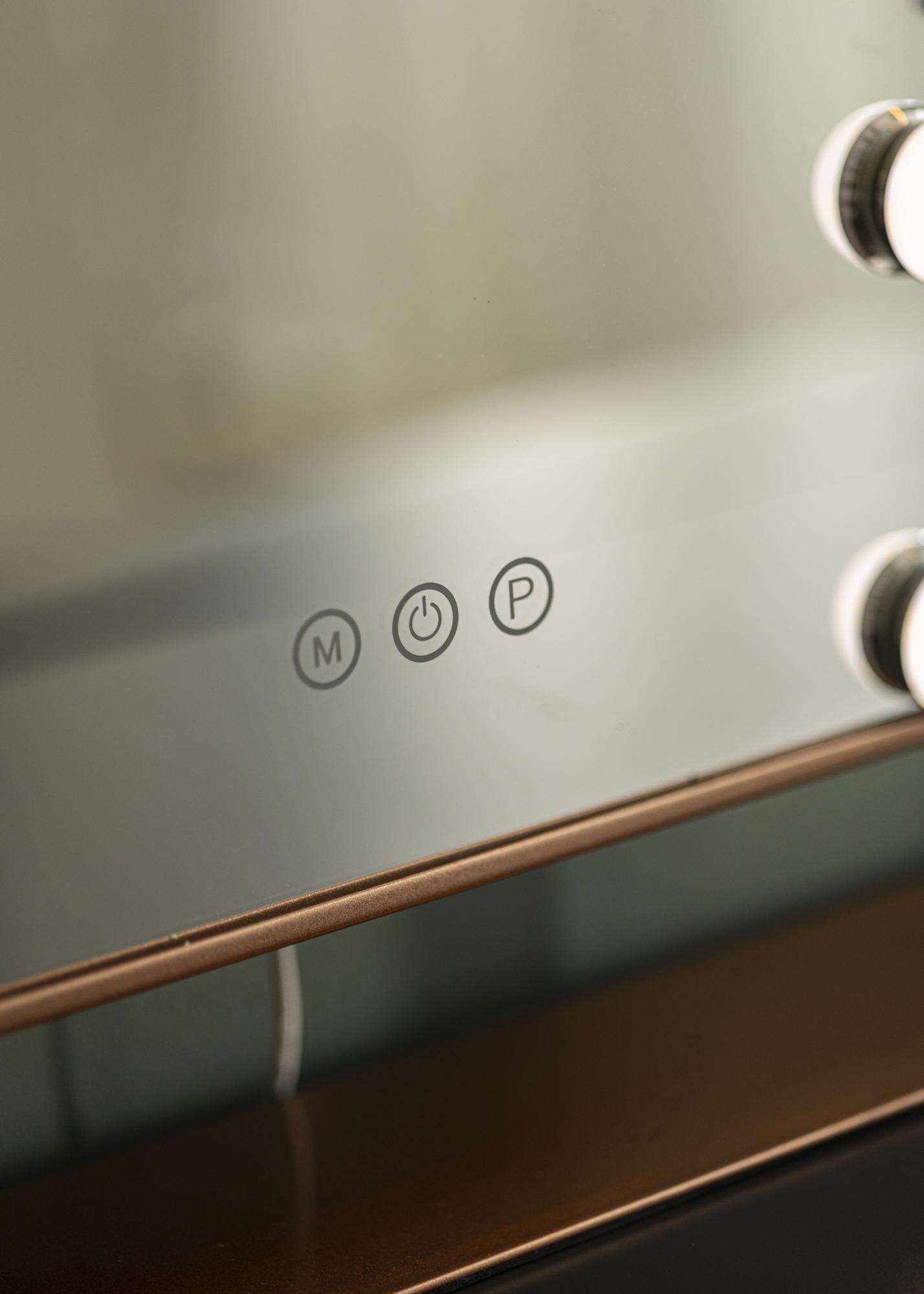 Това огледало има LED осветление, във формата на 12 по-големи лампи, които красиво заобикалят огледалната повърхност. Включвате огледалото с една от сензорните бутони на предната част на огледалото. Има също сензорни бутони за регулиране на яркостта и цветната температура. Бутонът отбелязан с "M" регулира цветната температура, а бутонът отбелязан с "P" настройва яркостта. Огледалото се свързва с ел.мрежата чрез щепсел.