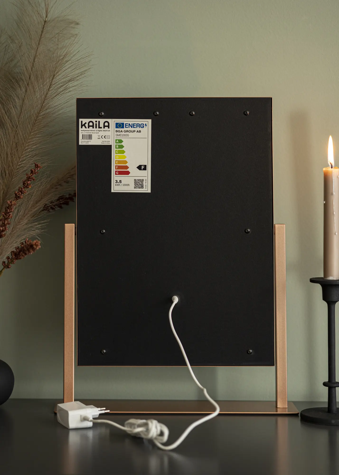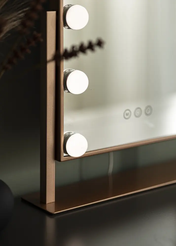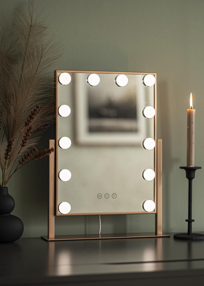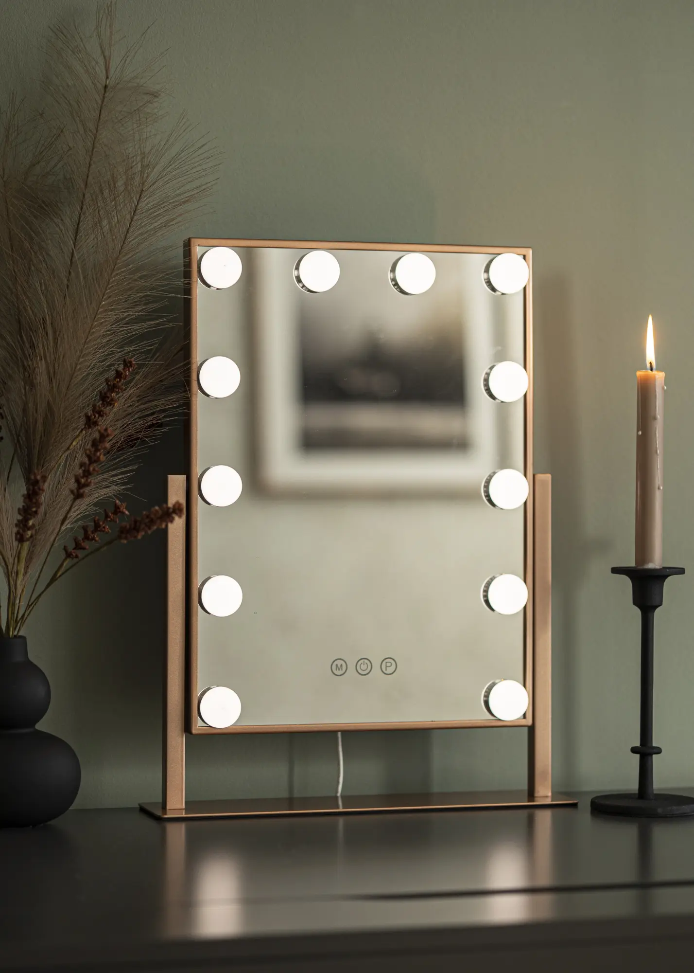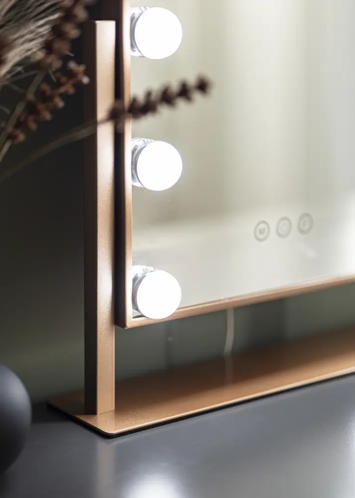 Това е компактно огледало за грим с площ на огледалото 30x41 см, вградена осветеност и елегантен нюанс на розово злато. Огледалото има стилна основа, което позволява лесното му поставяне на бюрото за грим, скрина или страничната масичка. За да можете по-лесно да се оглеждате и нанасяте грим, огледалото може да се накланя.