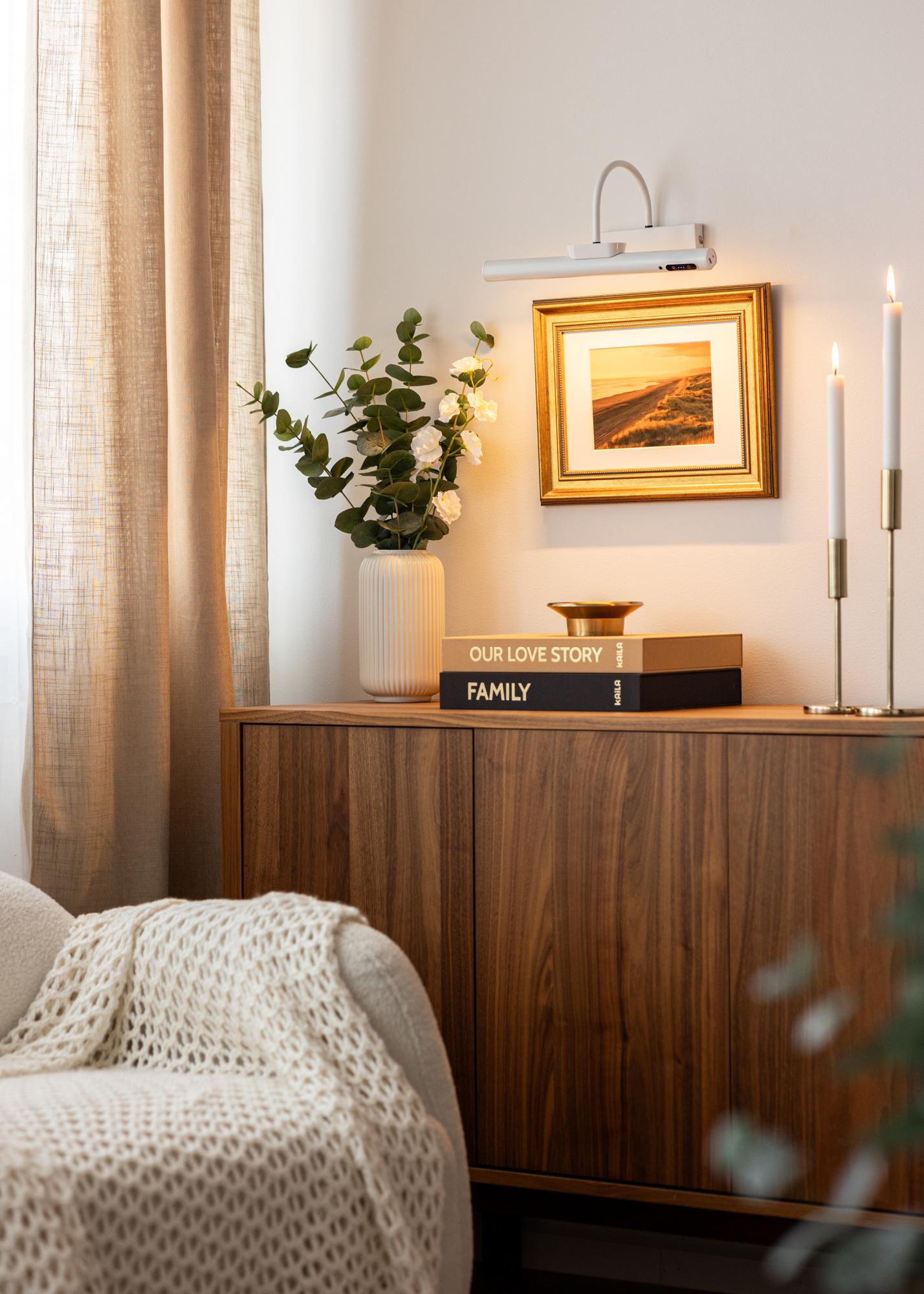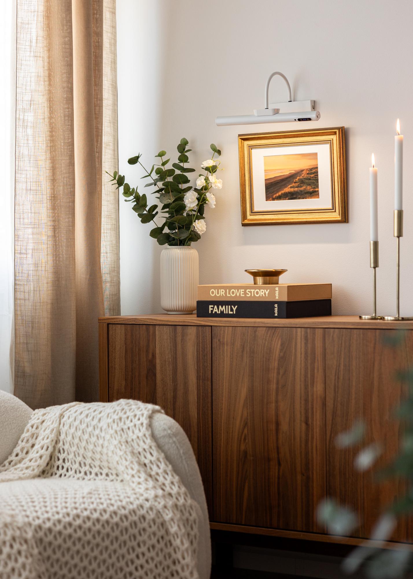 Това батерийно осветление за картини в бял дизайн е както практично, така и стилно. С възможността да избегнете видими кабели, можете да го поставите точно там, където е необходимо, за да подчертате вашите произведения на изкуството по най-добрия възможен начин. Осветлението разполага с LED източник на светлина, който осигурява приятно осветление и може да се регулира в три различни цветови температури (3000K, 4000K, 6000K), в зависимост от това кое пасва най-добре за вашето произведение на изкуството и обстановка.
