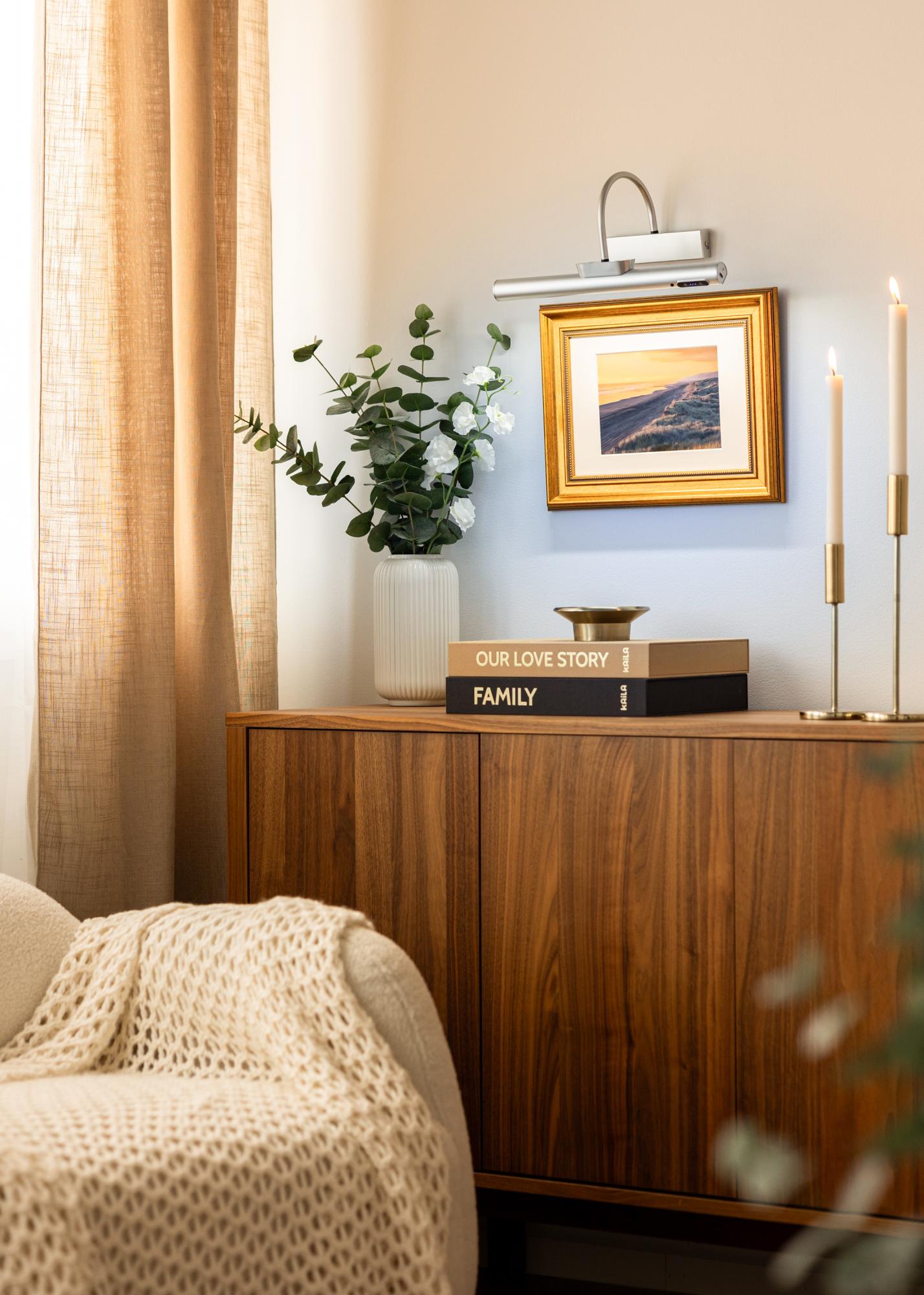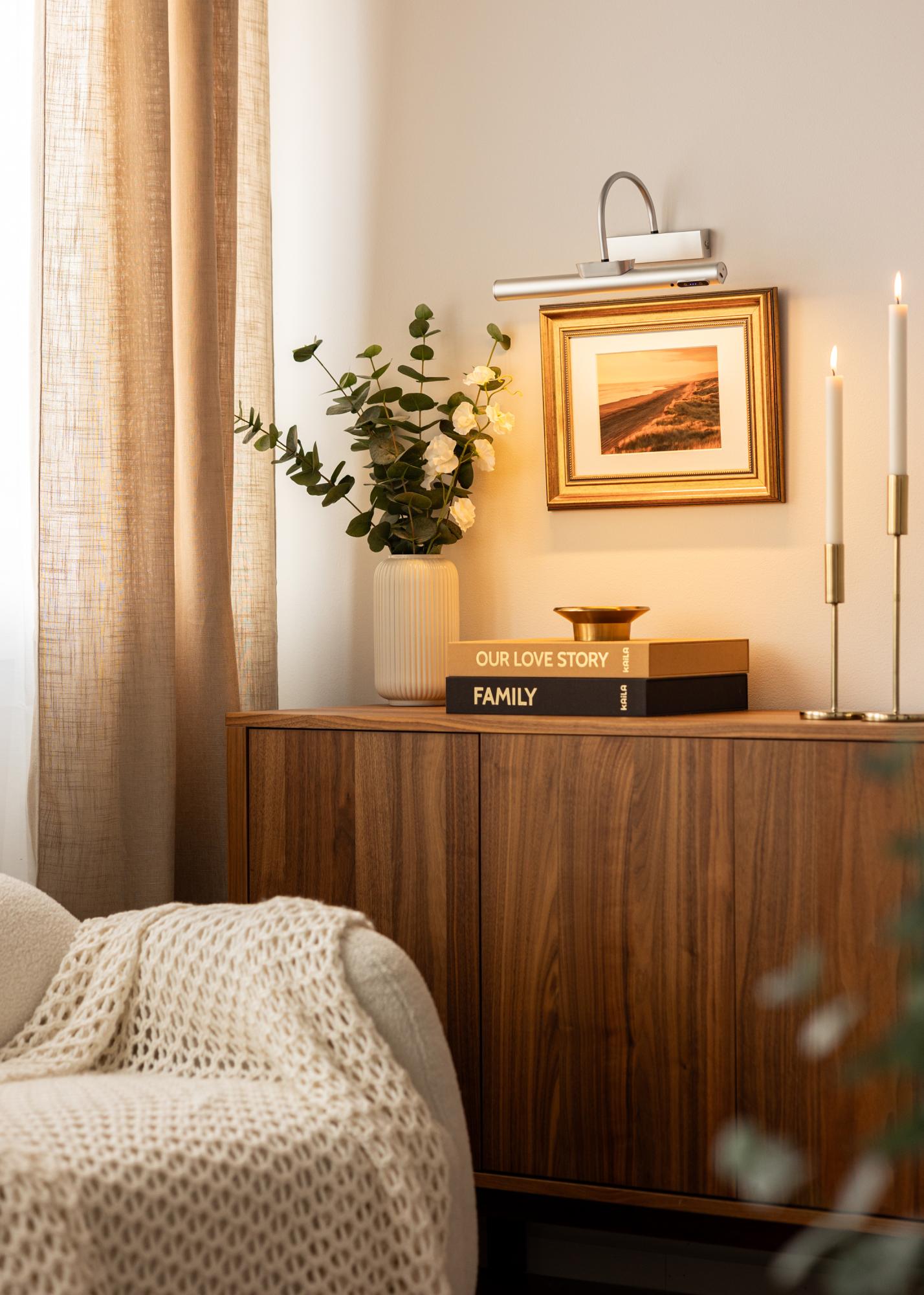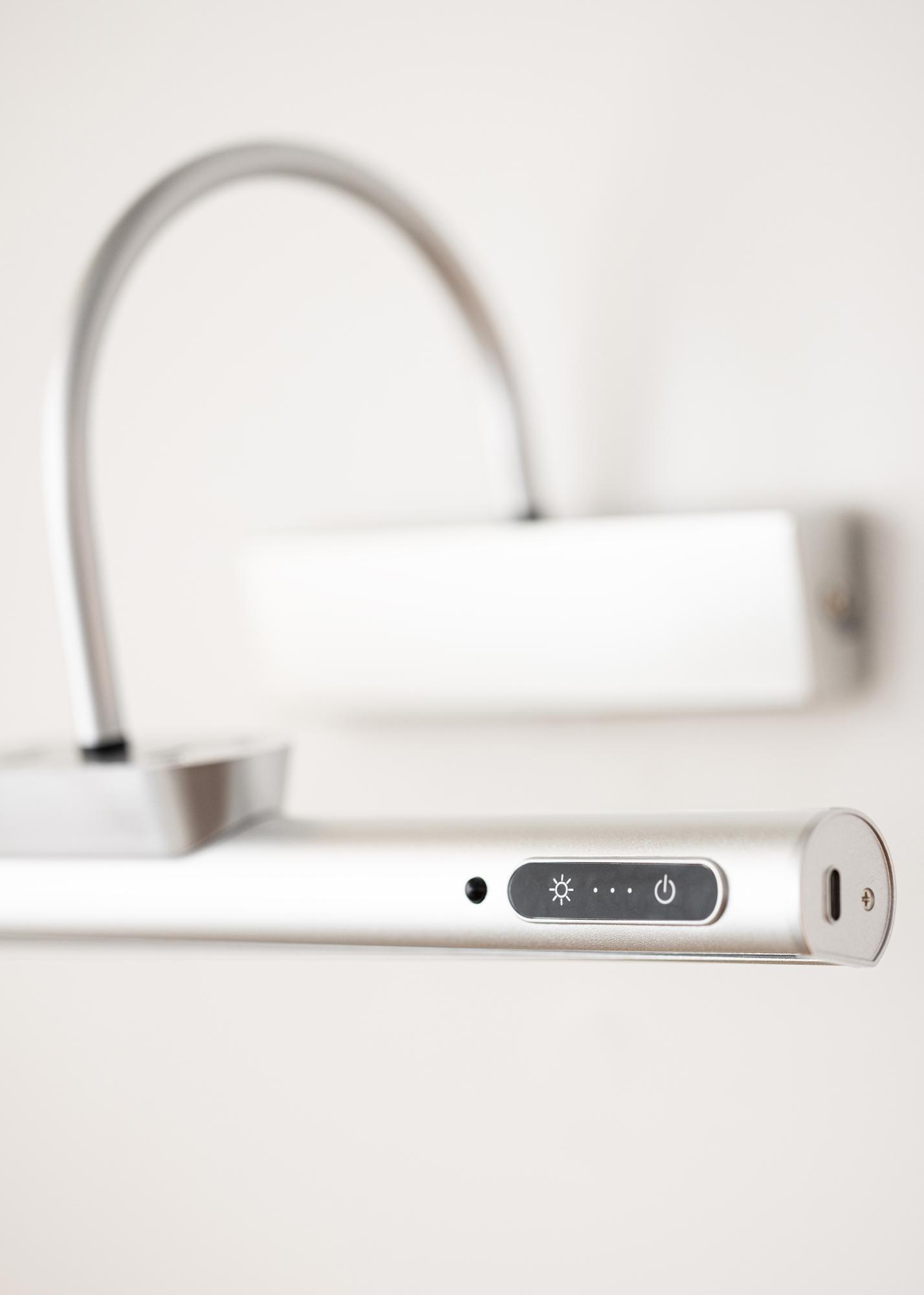 Това осветление за картини на батерии предлага стилно и гъвкаво решение за осветяване на вашите произведения на изкуството без неудобствата на кабели. С елегантния си сребърен цвят тя се вписва в повечето среди, независимо дали искате да осветите фотография, картина или друг вид стенен декор. Най-голямото й предимство е, че можете да я поставите навсякъде, без да мислите за близостта до електрически контакт.