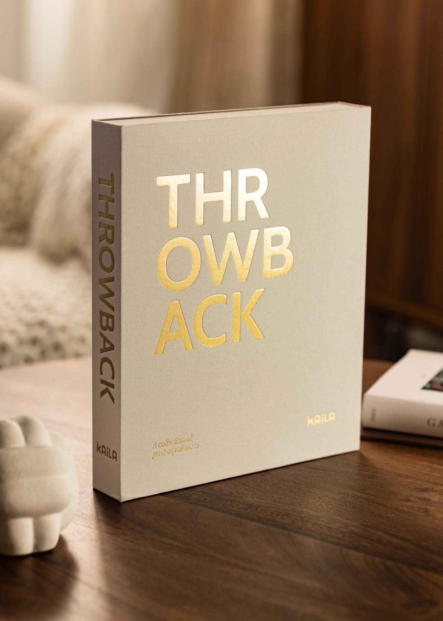 Това е много модерно фотоалбумче, което е луксозно опаковано като стилна книга за кафе маса – така нареченият Coffee Table Photo Album. Фотоалбумът е проектиран като изключителна кутия, която отваряте, за да получите достъп до съдържанието. Корицата е елегантно облечена в кремав текстил и златист печат с текста „THROWBACK“ краси както предната страна, така и гърба на албума. Това познато понятие за възстановяване на спомени придава на фотоалбума модерно и леко нахално усещане, тъй като наистина се отличава от класическите стилове на албумите. Албумът също има подзаглавие, което гласи „A collection of past experiences“, отпечатано в долния ляв ъгъл.