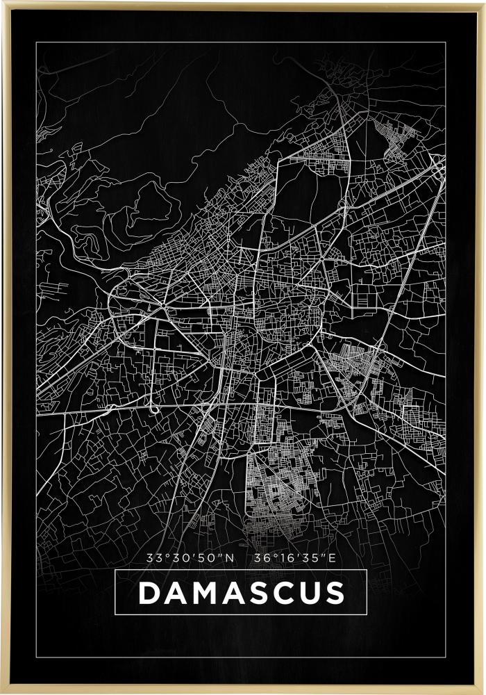 Ако Дамаск е особено близо до сърцето ви, тук имаме перфектния елемент за декорация. С печат в бяло върху черен фон, това е карта на града с малко допълнителна тежест. В долната част на изображението е отпечатано името Дамаск с големи букви, а числата за координатите на града са точно над него. Картата на града и името на града са красиво врамени с тънка бяла линия. Във външната част на постера има малко по-широка черна рамка, която ефективно създава немного пространство между рамката и картата на града, което подчертава мотива още повече. Не може да стане по-красив!