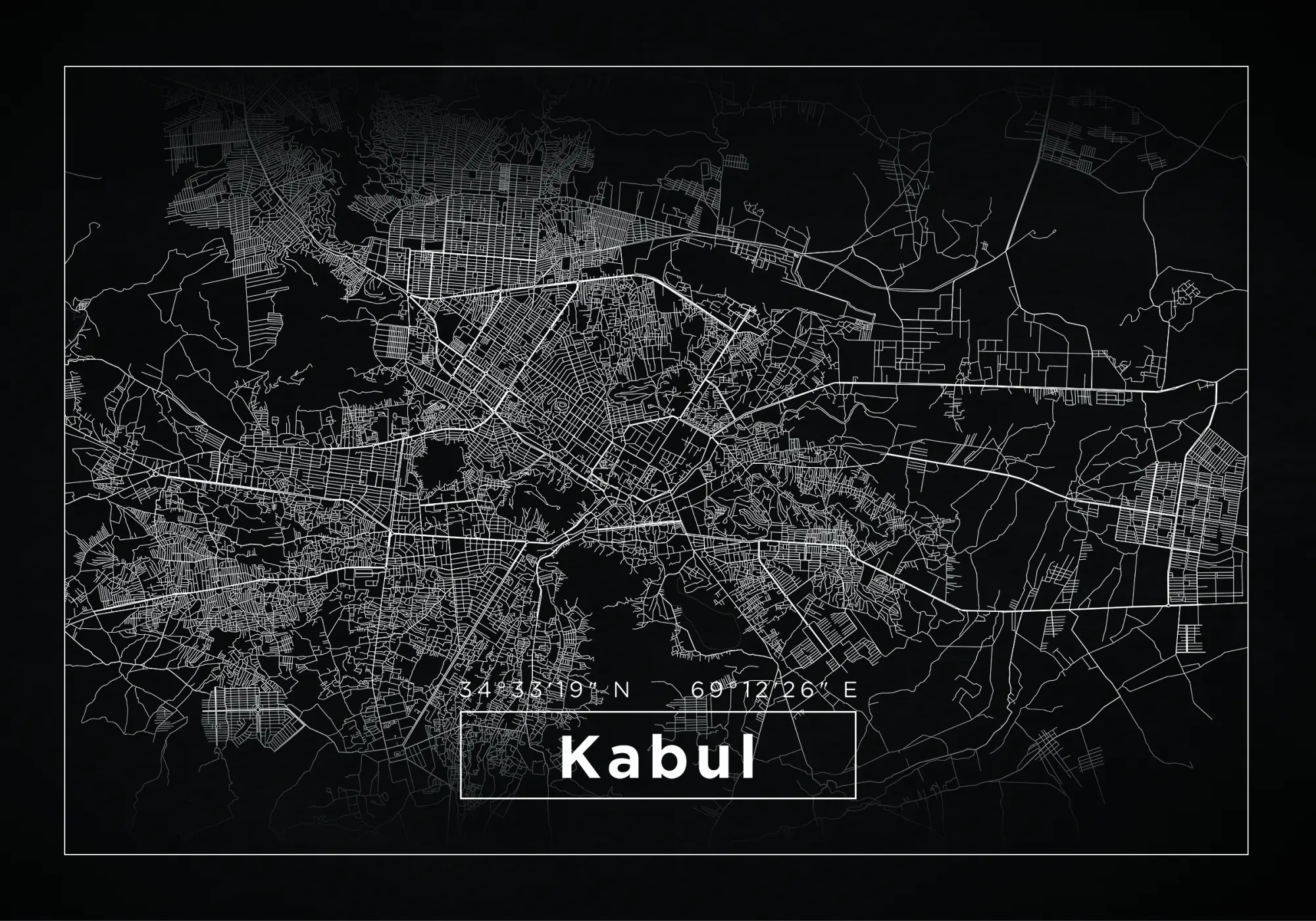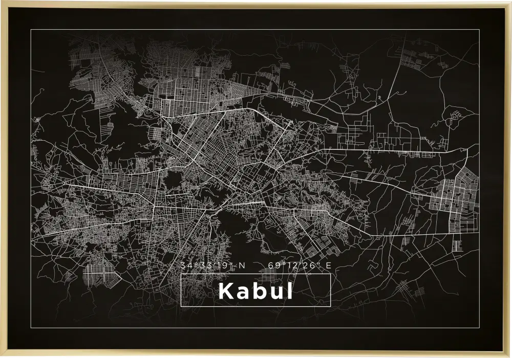 На тази карта на града Кабул се разпростира в хоризонтален формат в бяло върху черно. С израз, който напомня на негатив, улиците и площадите на града са изрязани в голяма минималистична мрежа, която в горната и долната част на изображението избледнява и е обградена от тънка бяла рамка. В долната част на изображението има отпечатан и рамкиран Кабул по същия начин като картата и отгоре са показани координатите на града. Една фантастично красива карта, която създава този малък, но специален акцент за точно вашата стена!
