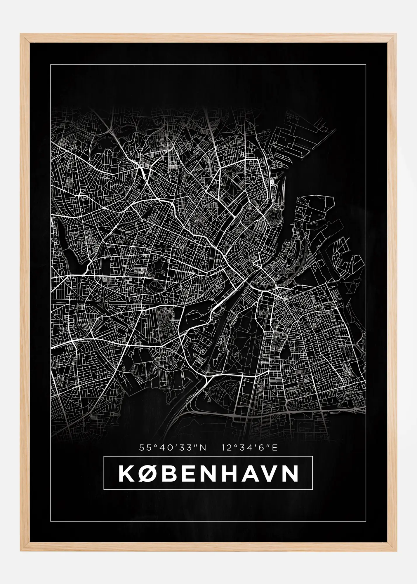 Тук имаме наистина впечатляваща градска карта на Копенхаген в черно и бяло. Тук виждаме цялата улична мрежа на града в минималистичен формат, която се простира от север на юг. Горната и долната част на картината се размиват и белите линии изчезват към черния фон. Във вътрешността на по-широк черен марж се намира тънка бяла рамка. Долу на картината е изписано Копенхаген на датски за правилното усещане и над него са написани координатите на града. Бялата рамка, която обгражда картата, също обгражда и името на града. Този постер с карта създава наистина впечатляващи контрасти и добавя наистина приятно усещане за тежест на мястото си. Истински привличащ погледа!