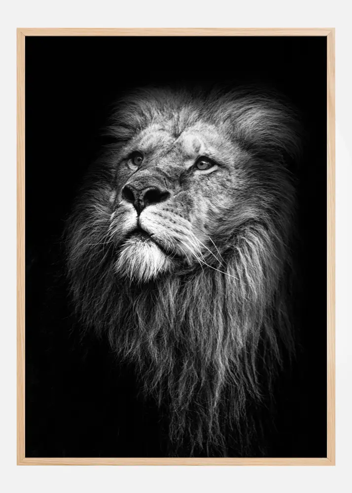 Един величествен плакат с портрет на самия лъв крал. Тази драматична снимка, която е осветена отпред, наистина подчертава силата на лъва. Добавете драма на вашите голи стени с помощта на този черно-бял плакат.