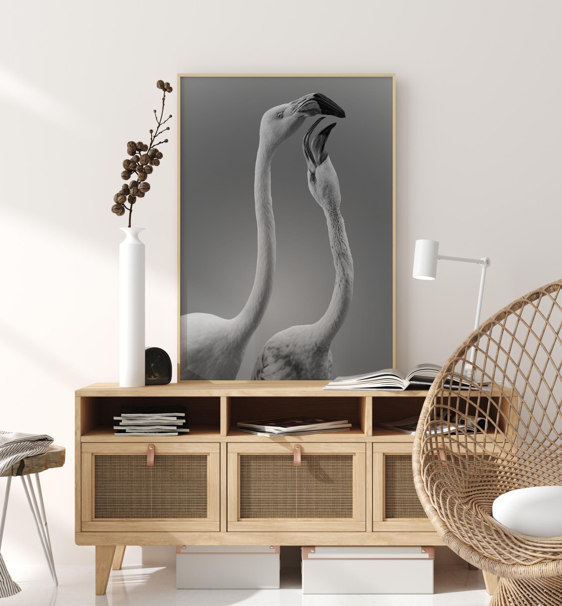Постер с природен мотив с два фламинга, които се накланят напред, за да се целунат. Фините сиви тонове в тази черно-бяла фотография ще се балансират красиво с пастелни цветове. Насладете се на спокойствие с тези две птици.