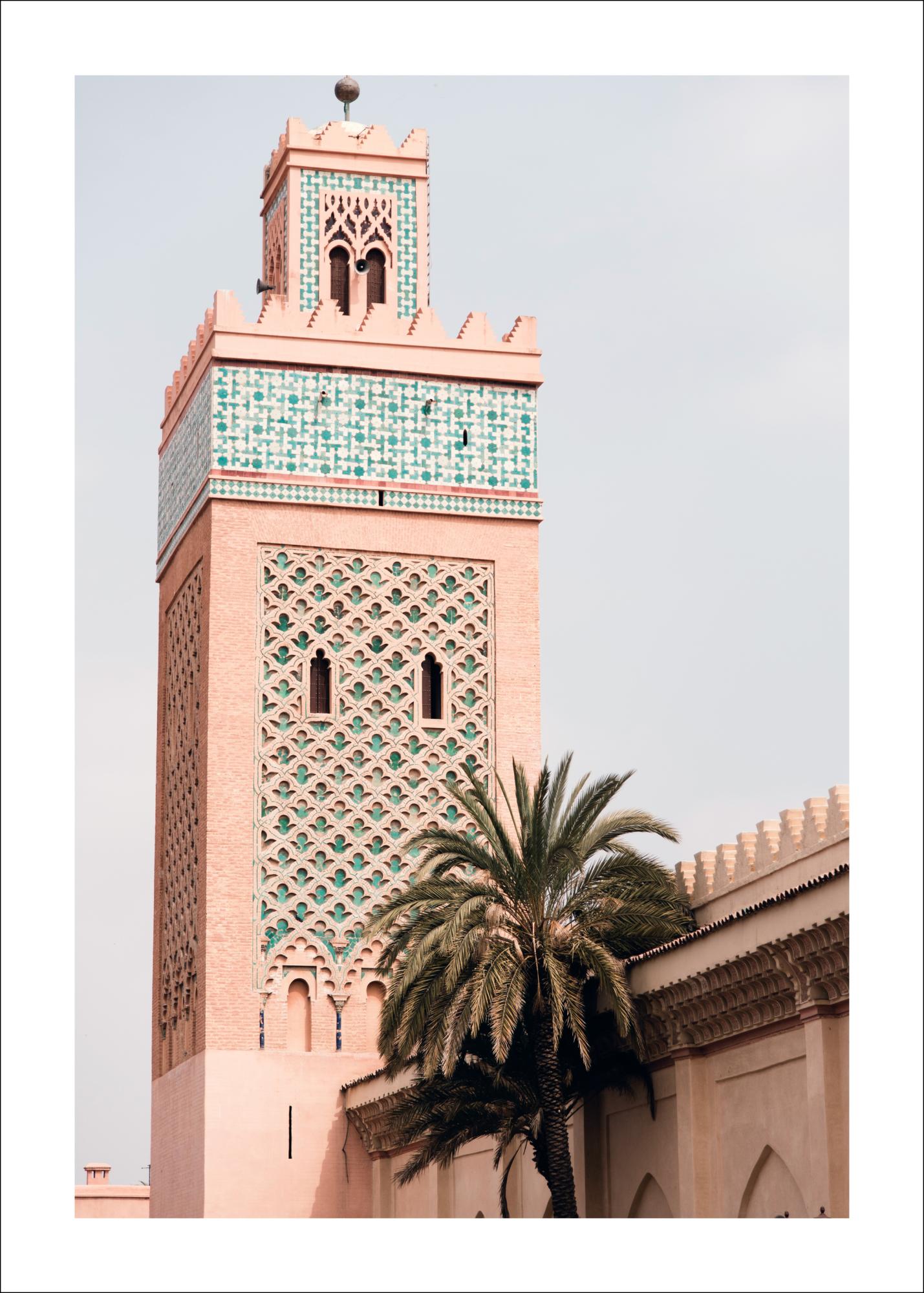 Постер с джамията Кутубия в Маракеш през деня. Красивите цветове на праскова и тюркоаз се сливи перфектно с ясно синия небосклон. На дъното на изображението стои самотна палма с клоните си, които покриват долната част на покрива на джамията. Тази прасковеноцветна каменна структура създава усещане за спокойствие.