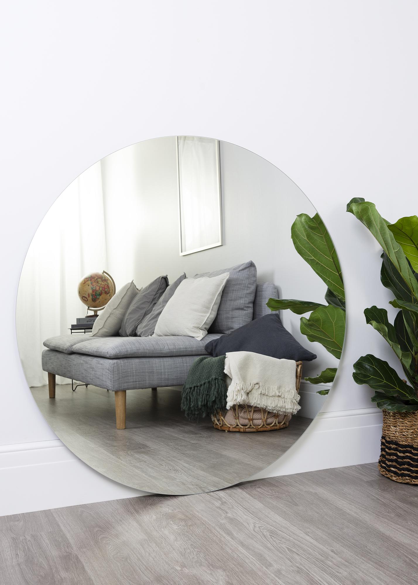 110 см Ø кръгло огледало, което е част от серия с кръгли огледала. Огледалото е изключително тънко и стилно и е подходящо за всички видове стаи и интериорни стилове.