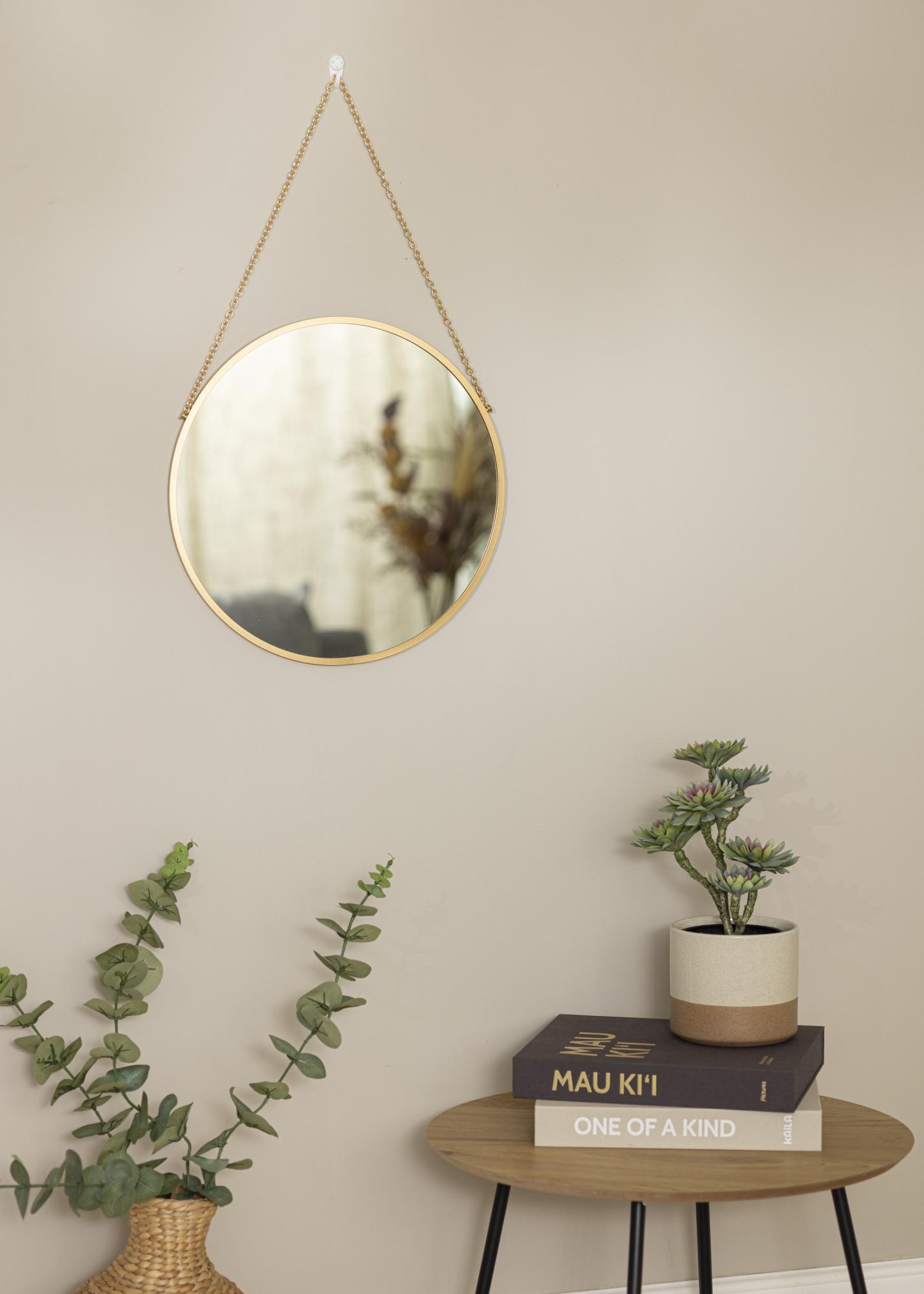 Нека това стенописало добави елегантност във вашия дом! Огледалото има изискан вид с кръгла форма и тънка рамка с дълбочина само 8 мм. Тънката рамка е изработена от метал и е в луксозен златист цвят. Елегантното впечатление се допълва от златната верига, която се използва за окачване.