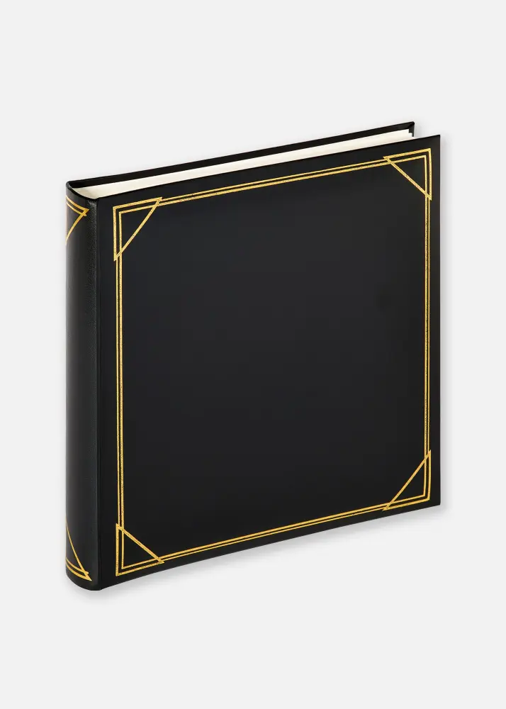 Съберете най-добрите си снимки и други малки хартиени спомени в стилен и прост албум! Този черен албум съдържа 50 бели страници, върху които можете да създадете лични колажи. Тънките пергаментни листа защитават вашите снимки вътре в албума. Корица е изработена от луксозна изкуствена кожа и има декоративни златни отпечатъци под формата на линии и триъгълници.