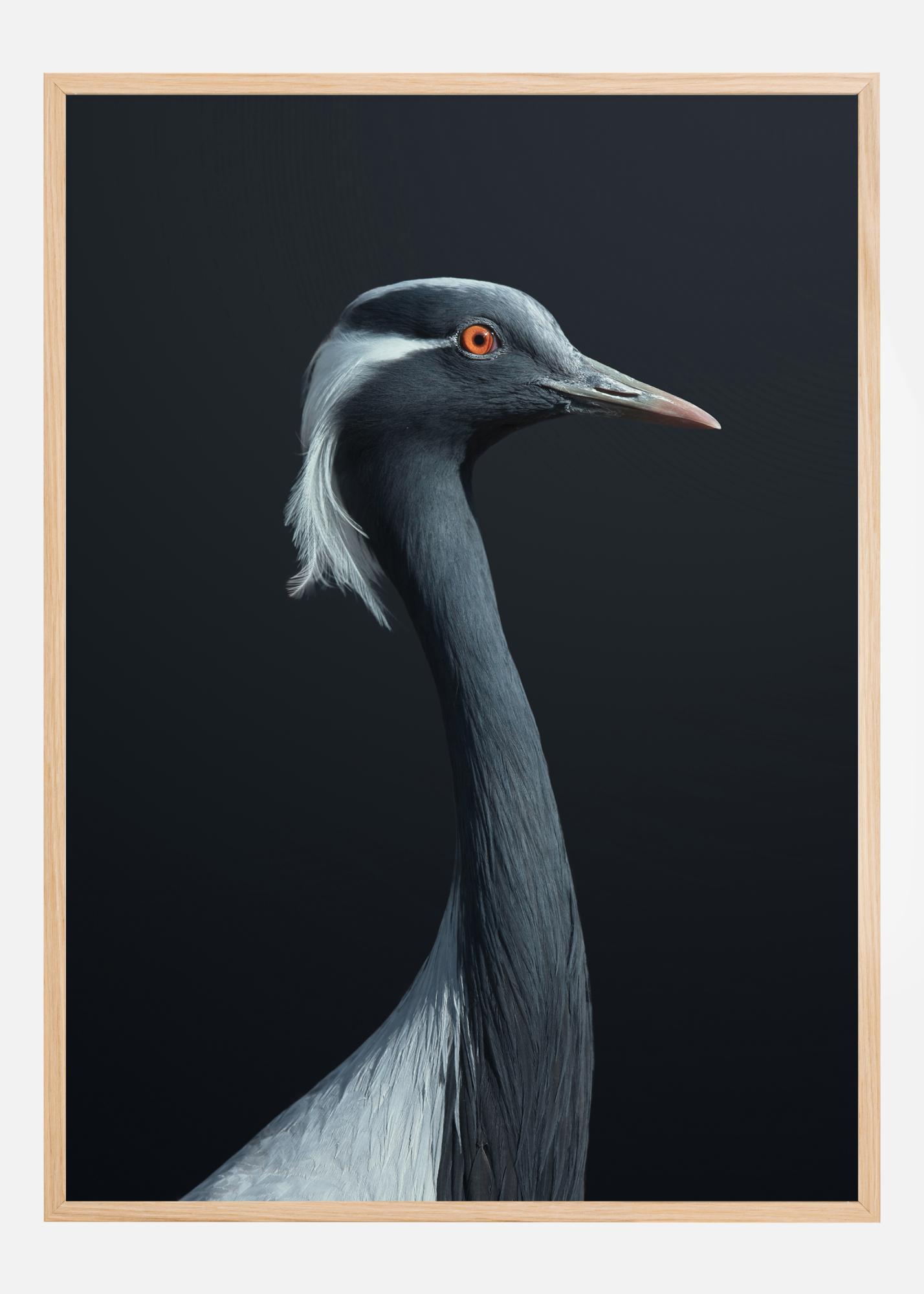 Близък план на дългошейна черно-бяла птица. Красивите черни пера на птицата водят към бяло тяло, което съответства на нейната корона. Впечатляваща снимка на черно-бяла птица на сив фон с оранжево и черно око, което гледа надясно. Перфектен отпечатък за любител на птици.