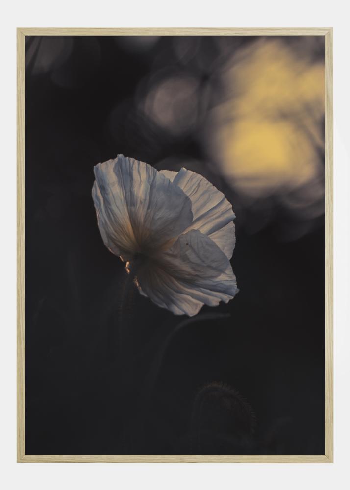 Този постер улавя същността на спокойния здрач с един единствен мак на преден план, осветен от последните лъчи на залеза. Цветето е деликатно и детайлно, неговите венчелистчета са в светъл, почти прозрачен нюанс на бяло и светлосиньо, които контрастират с топлия, замъглен фон на залеза в нюанси на оранжево и кафяво.