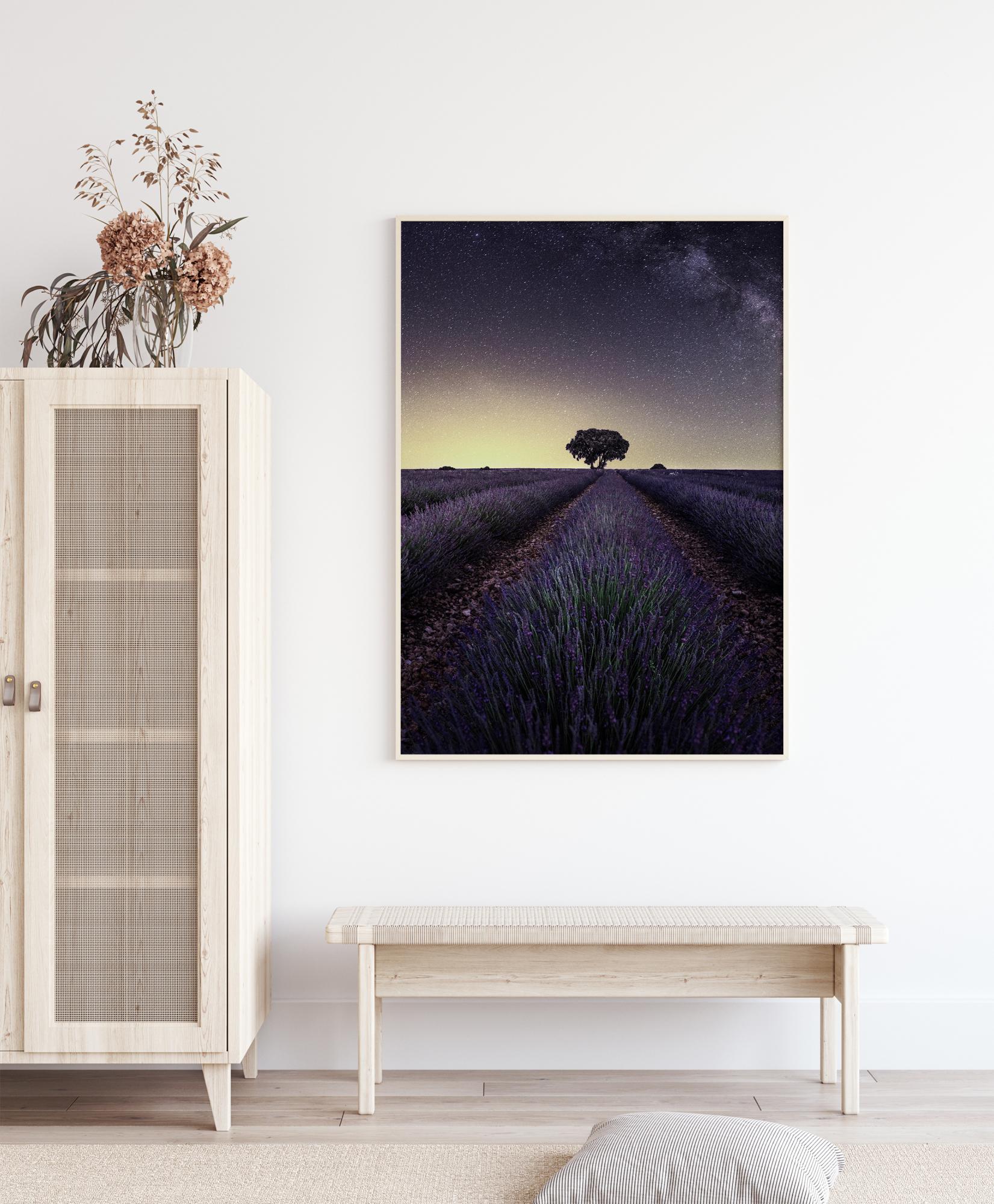 Един напълно омагьосващ плакат на лавандулово поле. Интензивните нюанси на лилавата лавандула, които са перфектно съчетани помежду си, танцуват в сутрешния бриз. Едно самотно дърво е осветено от ранното утринно слънце и е допълнено от тъмното звездно небе. Закачете този отпечатък във вашата кухня за естествена атмосфера.