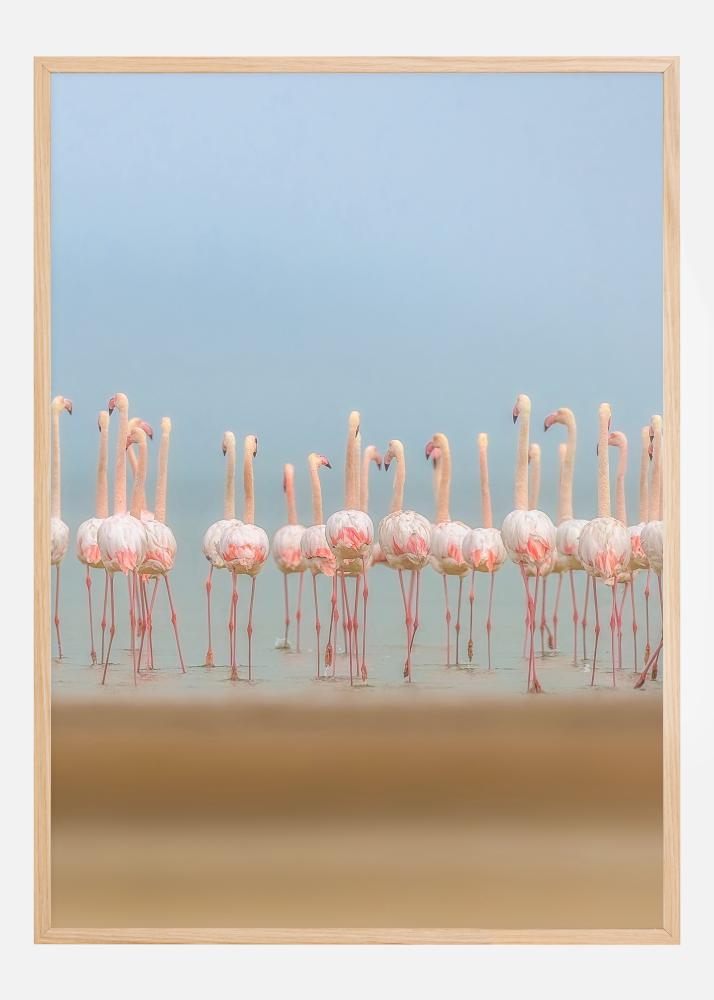 Спектакулярен постер с ято фламинго на брега на водата. Прекрасните същества са уловени отзад и техният цвят е подчертан от неутралните тонове на небето и пясъка. Перфектно за поставяне в спалня поради фантастичния си финес.