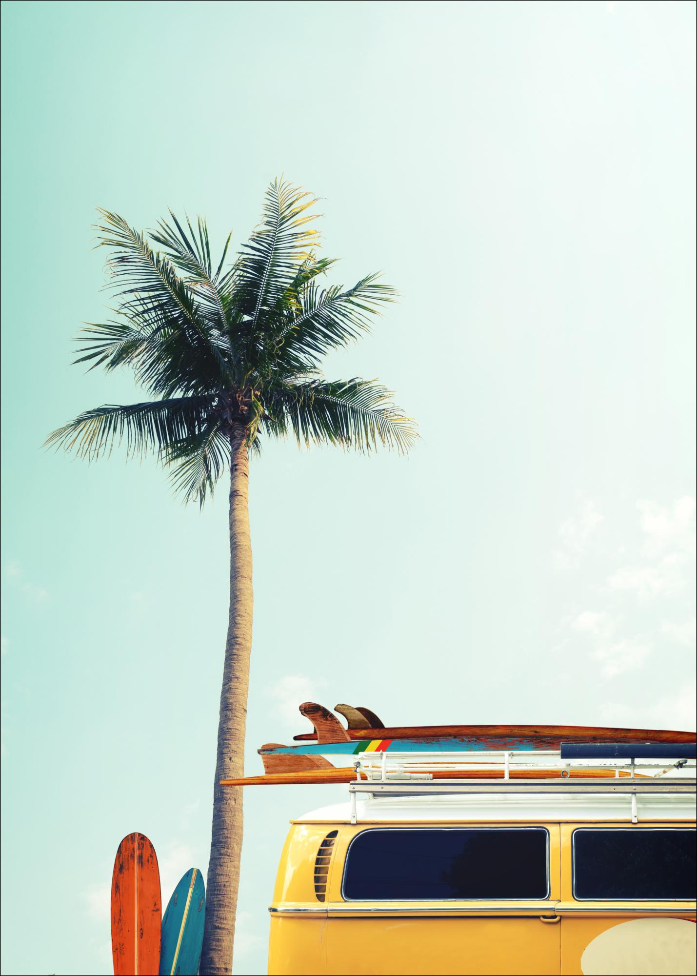 Фотографски плакат с класическия фолксваген бус със своите сърф дъски, паркиран до палма под безоблачно небе. Цветен плакат, който създава приятно усещане за лято и свобода. Комбинирайте с други любими постери на по-голяма стена с картини.