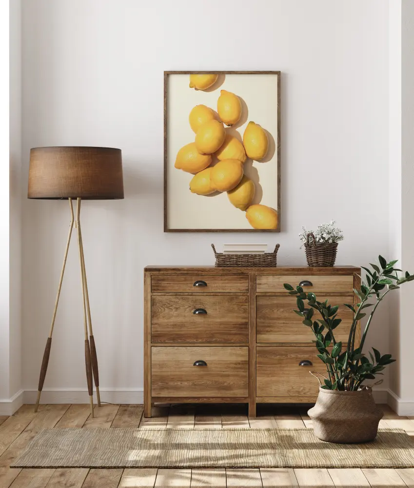 Реалистичен постер на лимони. Светлината отгоре се проектира директно върху плодовете, което подчертава грапавостта на кората. Светлината създава сенки, които се разпростират върху белия фон. Усетете аромата на свежестта на този цитрусов плод, когато окачите тази щампа в кухнята си.