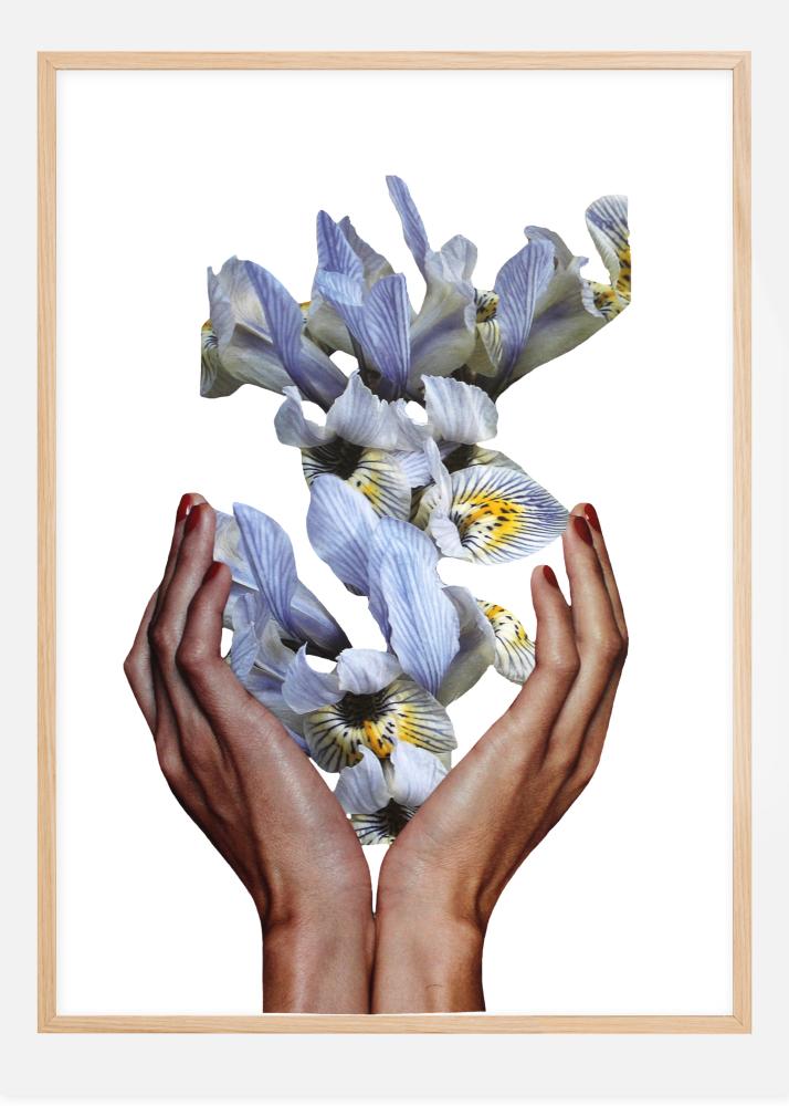 Красива цветна картина на бледолилави ириси. Нежно отворени ръце с красиво боядисани нокти внимателно държат ирисите. Бял фон подчертава меките лилави и жълти цветове и създава деликатен, но красив цветен образ. Отпускащ плакат, който вдъхва живот на обикновена бяла стена.