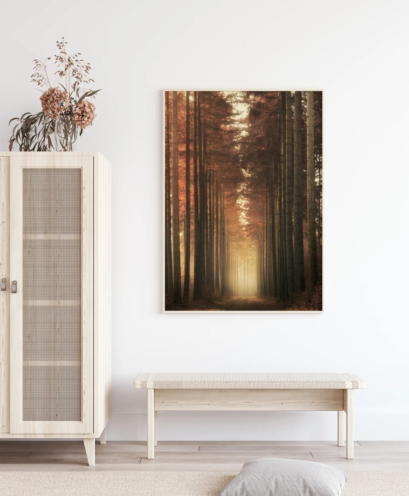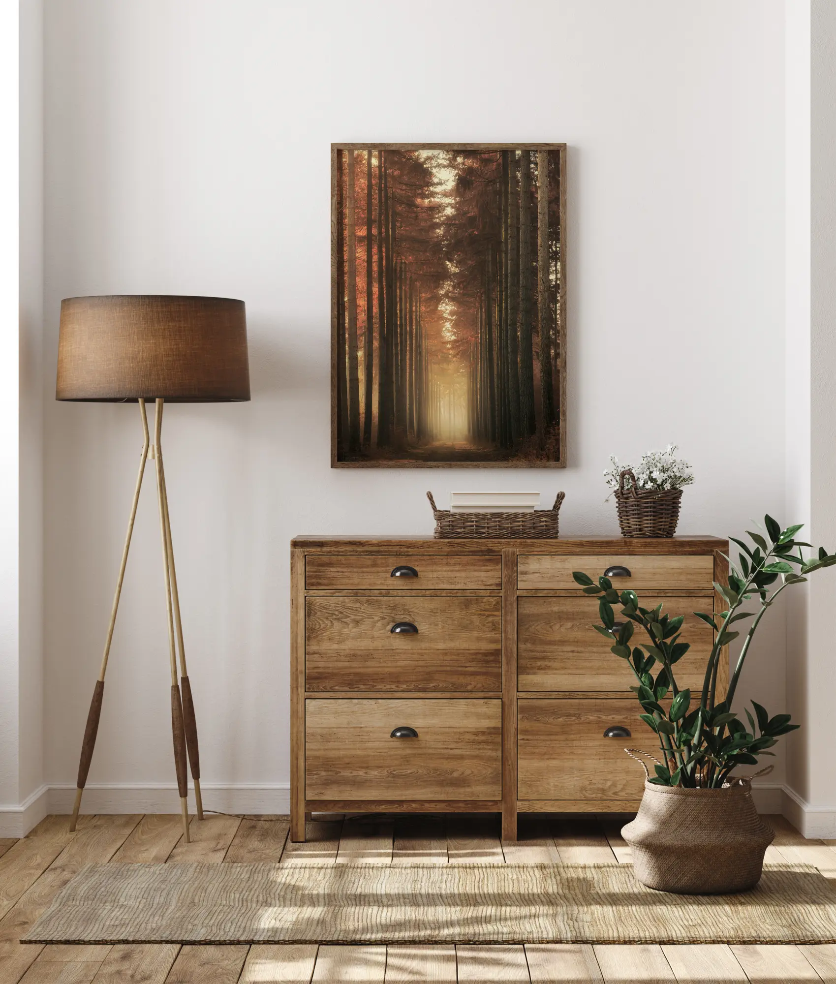 Един зашеметяващо красив природен печат на красива алеята с високи дървета. Естествената светлина прониква през дърветата и подчертава прекрасните кафяви листа, създавайки усещане за топлина и спокойствие. Един много красив постер, който може да бъде окачен във всяка среда, за да създаде топлина, красота и спокойствие.