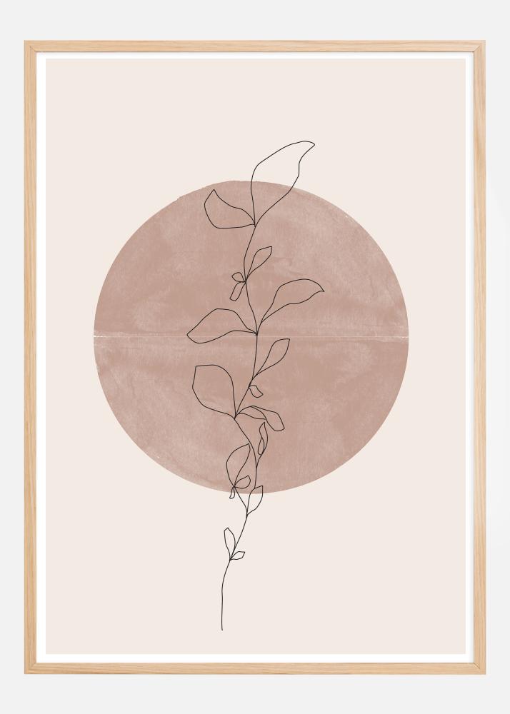 Този постер представя деликатна линейна илюстрация на цъфтяща клонка, чиито контури играят срещу голям, нарисуван кръг в успокояващ, земен нюанс. Контрастът между минималния цветен мотив и силния фон създава интересна динамика, която е както успокояваща, така и естетически привлекателна.