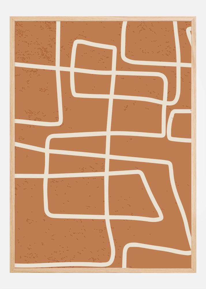 Този минималистичен и стилен плакат представя мрежа от чисти линии, които формират вид абстрактна карта или кубистичен пейзаж. Бежовите линии пресичат топло терракотово фоново и създават усещане за ред и структура върху меката текстурирана повърхност. Това е принт, който е отличен за онези, които ценят модерния дизайн и по-топлия цветен спектър в дома или офиса си.