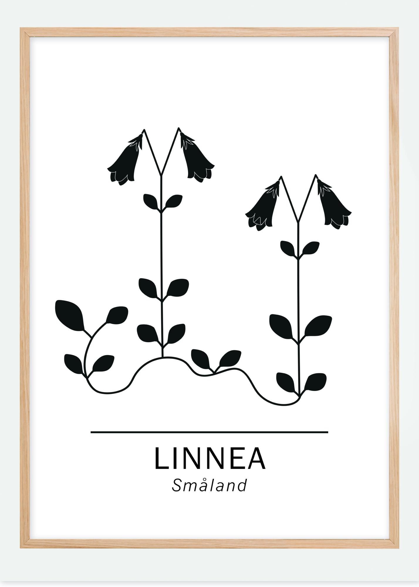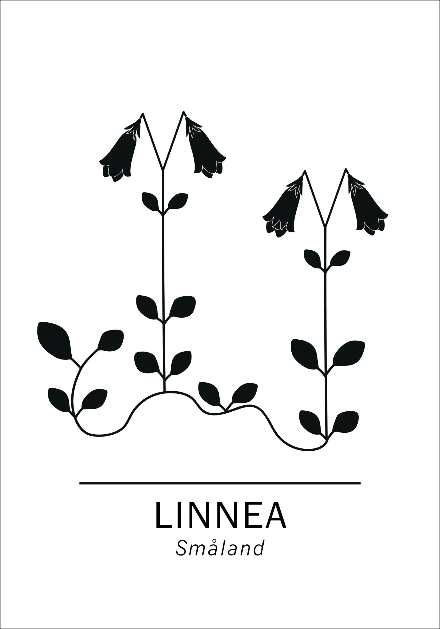 Красива черно-бяла минималистична картина с две черни линеи. Под цветята има вълновиден ред от листа, които свързват двете стъбла и текста ”Линея, Смоланд”. Скромна, но стилна картина, която създава усещане за простота. Окачете този постер на обикновена бяла стена, за да създадете артистичен вид.