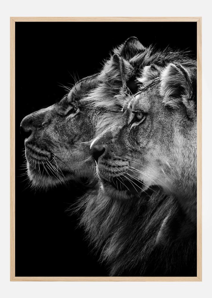 Завладяващ черно-бял печат на лъв и лъвица. На фона на черния фон тези великолепни същества имат израз на концентрация. Естествената светлина осветява челюстите на животните, което ги кара да изглеждат още по-доминиращи. Перфектен постер за всички любители на животните.