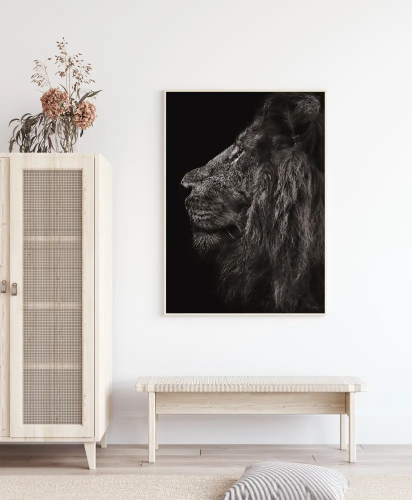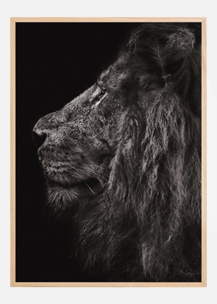 Един величествен черно-бял отпечатък с лъв, който гледа наляво в отпечатъка. На черен фон меката светлина подчертава носа и бузите на лъва. С дългата си, гъста козина това невероятно създание чака своята плячка в тишина. Перфектен постер за всички, които обичат големи диви котки.
