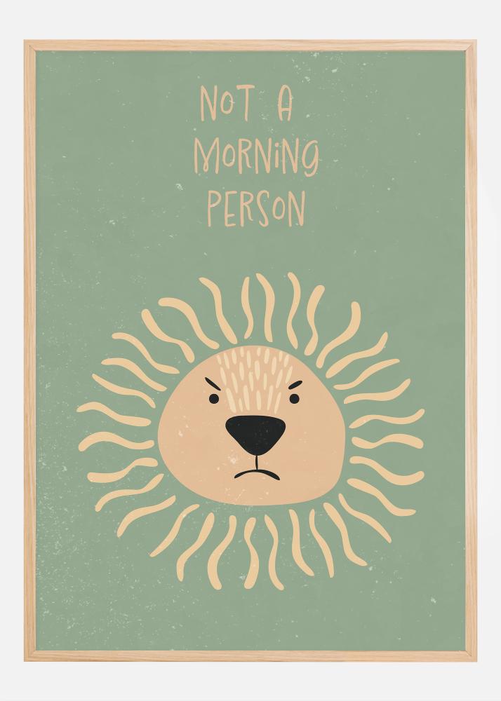 С игриво изражение и очарователно послание, този постер е забавен детайл за всички, които не са съвсем утринни хора. Илюстрацията изобразява сладко лъвче с прическа, която напомня слънчеви лъчи, придружена от текста "NOT A MORNING PERSON" в непринуден, ръкописен стил. Заглушеният зелен нюанс на фона създава успокояващ ефект, докато топлите жълти и бежови тонове на лъвчето създават мека и привлекателна атмосфера.