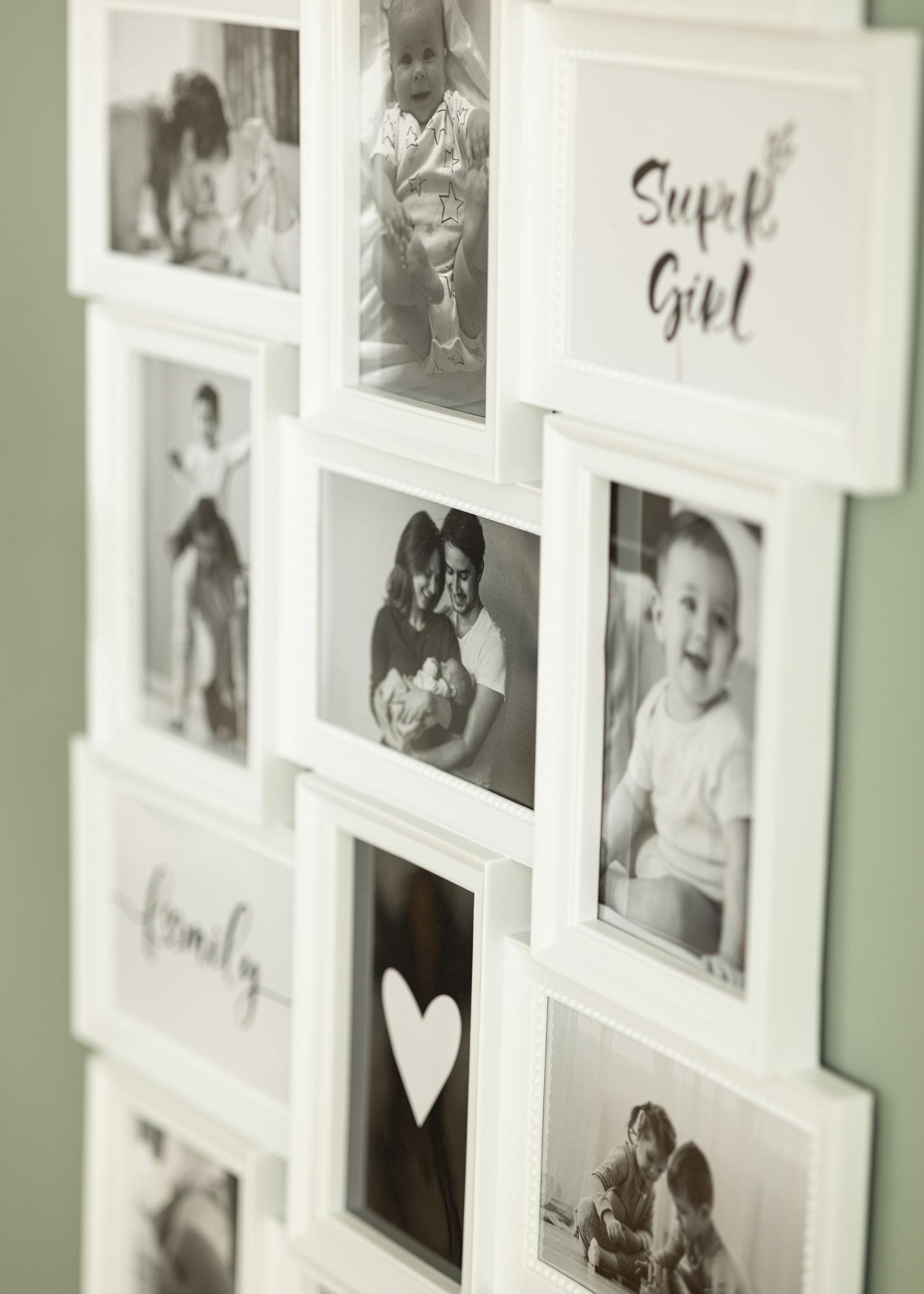 Тази колажна рамка побира цели 21 снимки с размери 10x15 см. Това ви позволява да съберете всички любими снимки на роднини, приятели и семейство. Ако комбинирате вашите фотографии със снимки на цитати или графични мотиви, ще получите окачване, което е едновременно красиво и вълнуващо!