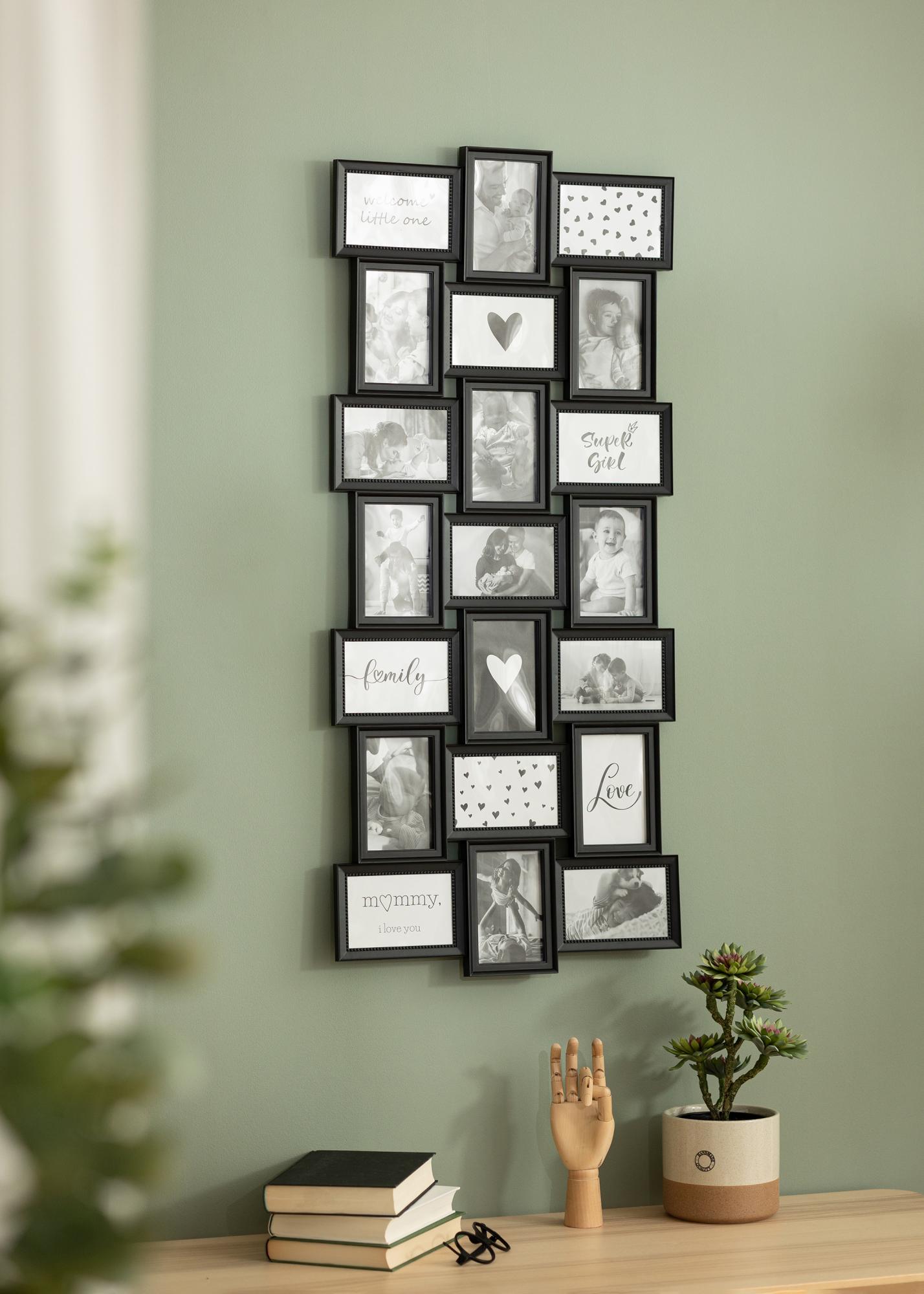 Имате ли голямо семейство, чиито множество снимки искате да закачите на стената? Тогава тази колажна рамка е много добър избор – тя побира цели 21 фотографии! Рамката е подходяща за снимки с размери 10x15 см и комбинира изображения в както портретен, така и в пейзажен формат. Различните формати са разположени симетрично, което придава много стилен израз. Можете сами да изберете дали да монтирате рамката в вертикално или хоризонтално положение.