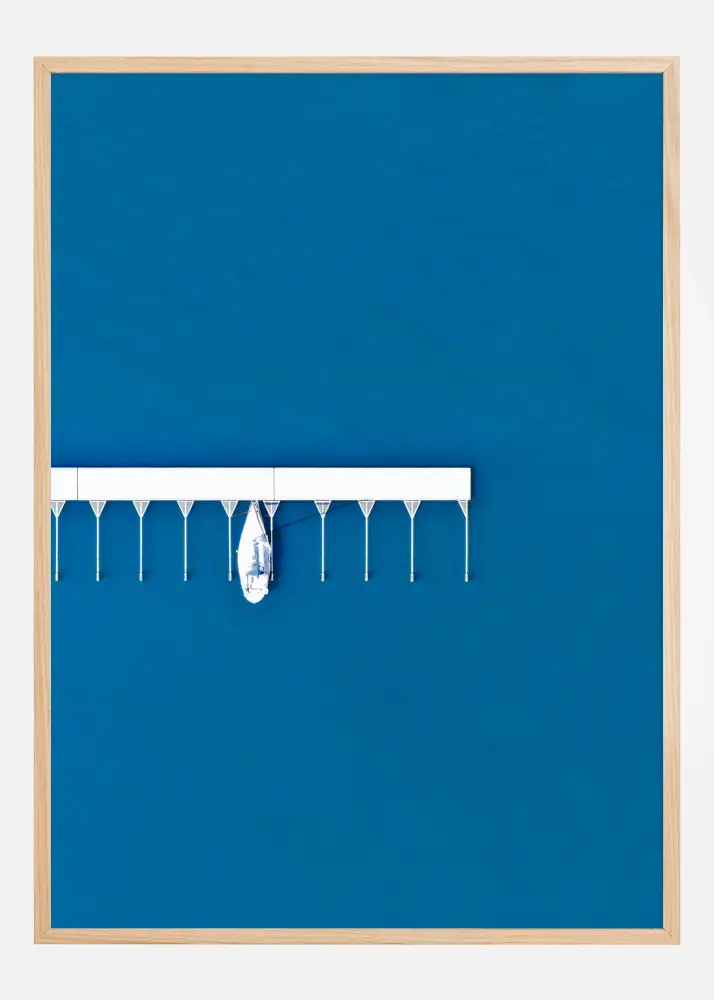 Това произведение на изкуството със заглавие "Lonely Sail" изобразява бяла ветроходна лодка, която е акостирала край пристанище, което се простира над ясната, синя вода. Силният контраст между минималистичните бели линии на лодката и пристанището срещу дълбокосиния фон създава силен визуален ефект, който подчертава изолацията на лодката и красотата на откритото пространство.