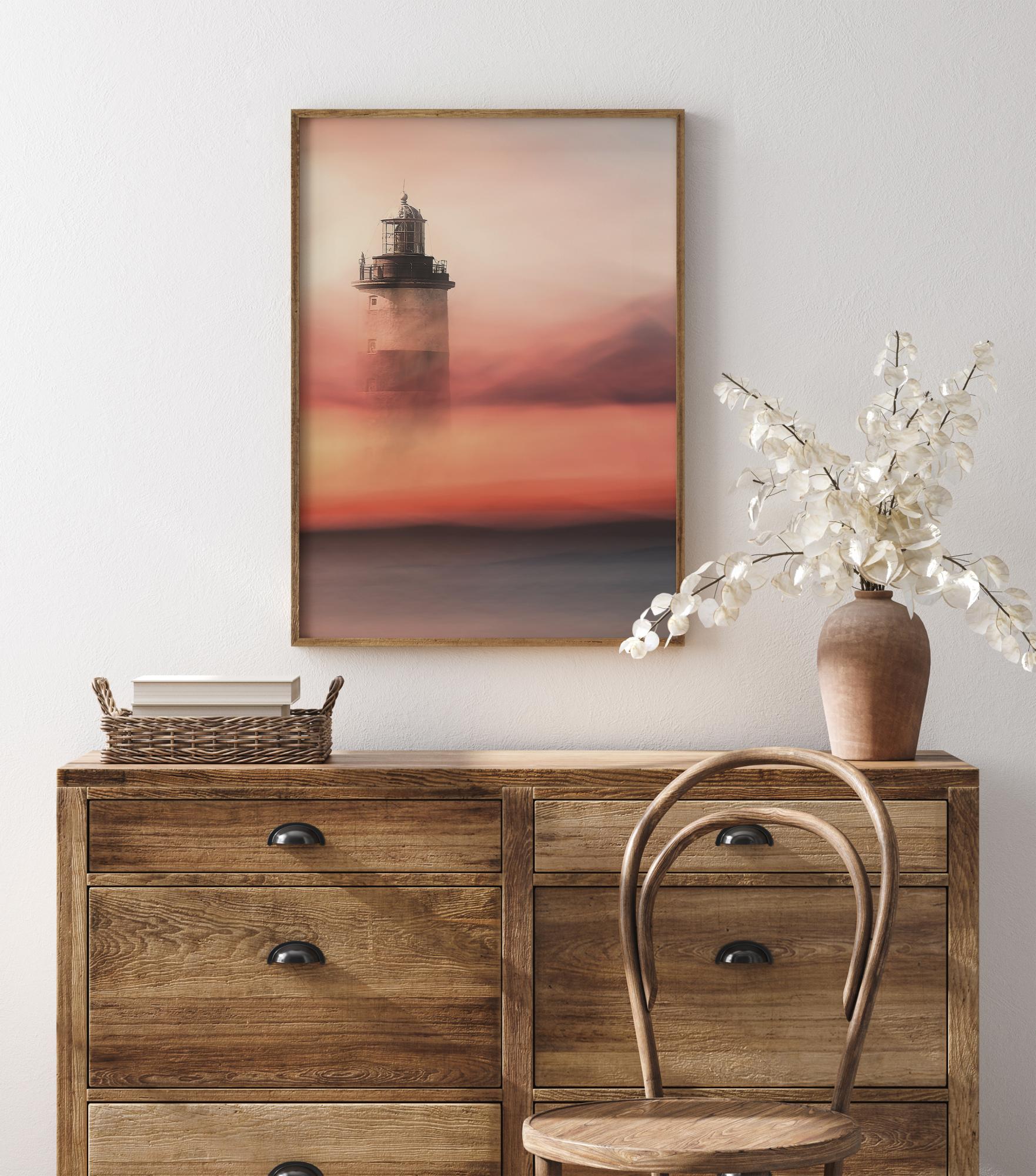 Един красив романтичен принт на фар в морската мъгла. Меките, розови пастелни цветове създават усещане за романтика, докато мекото синьо море придава по-тъмен тон на този красив постер. Усетете и чуйте морския бриз, когато окачите тази картина в дома си.