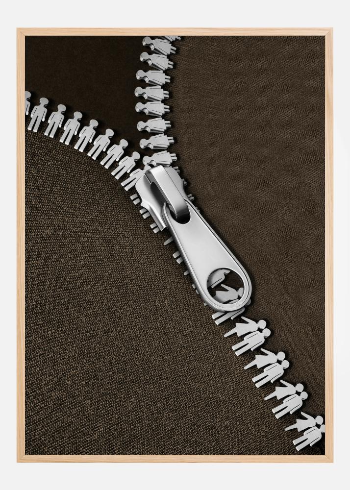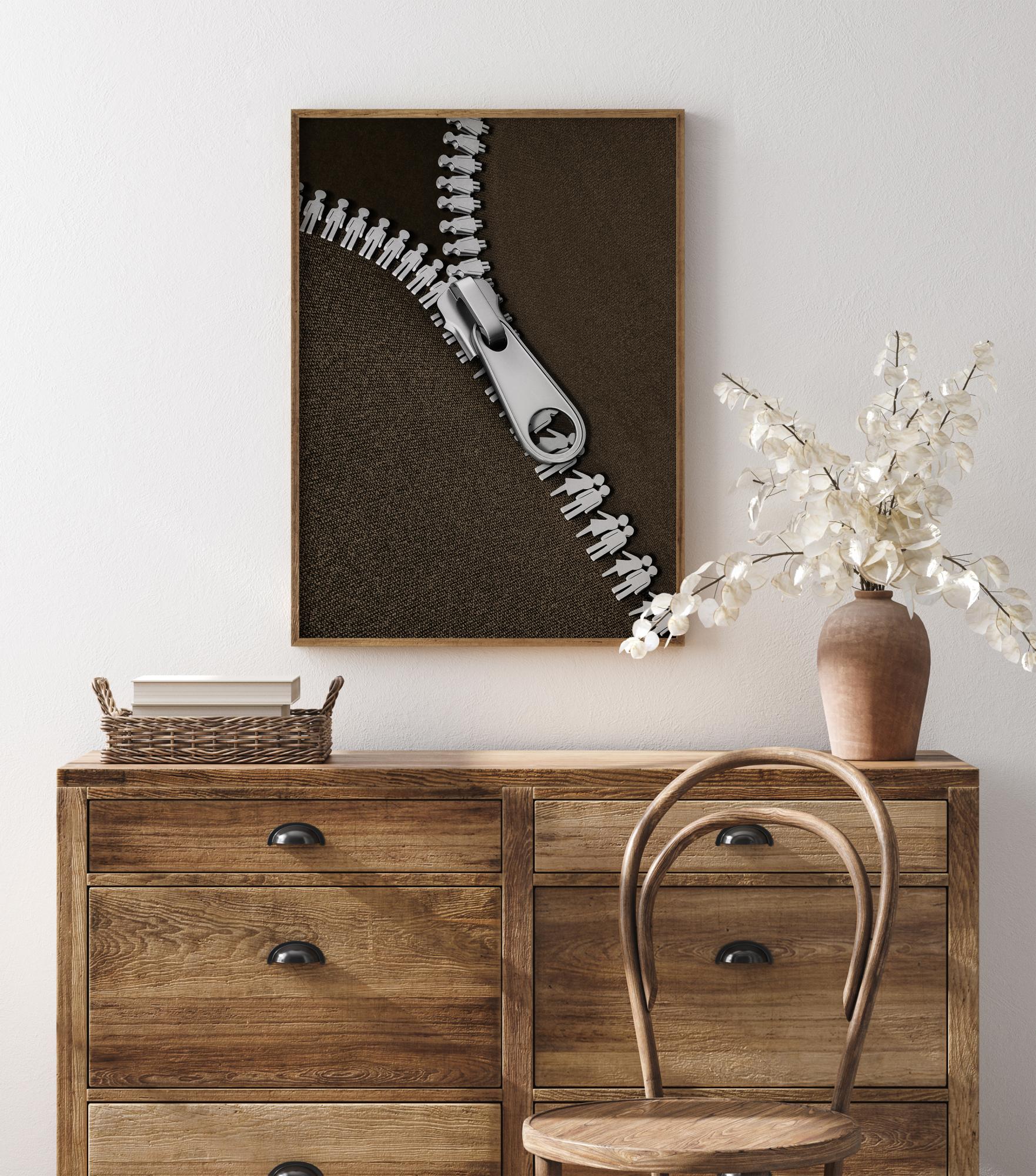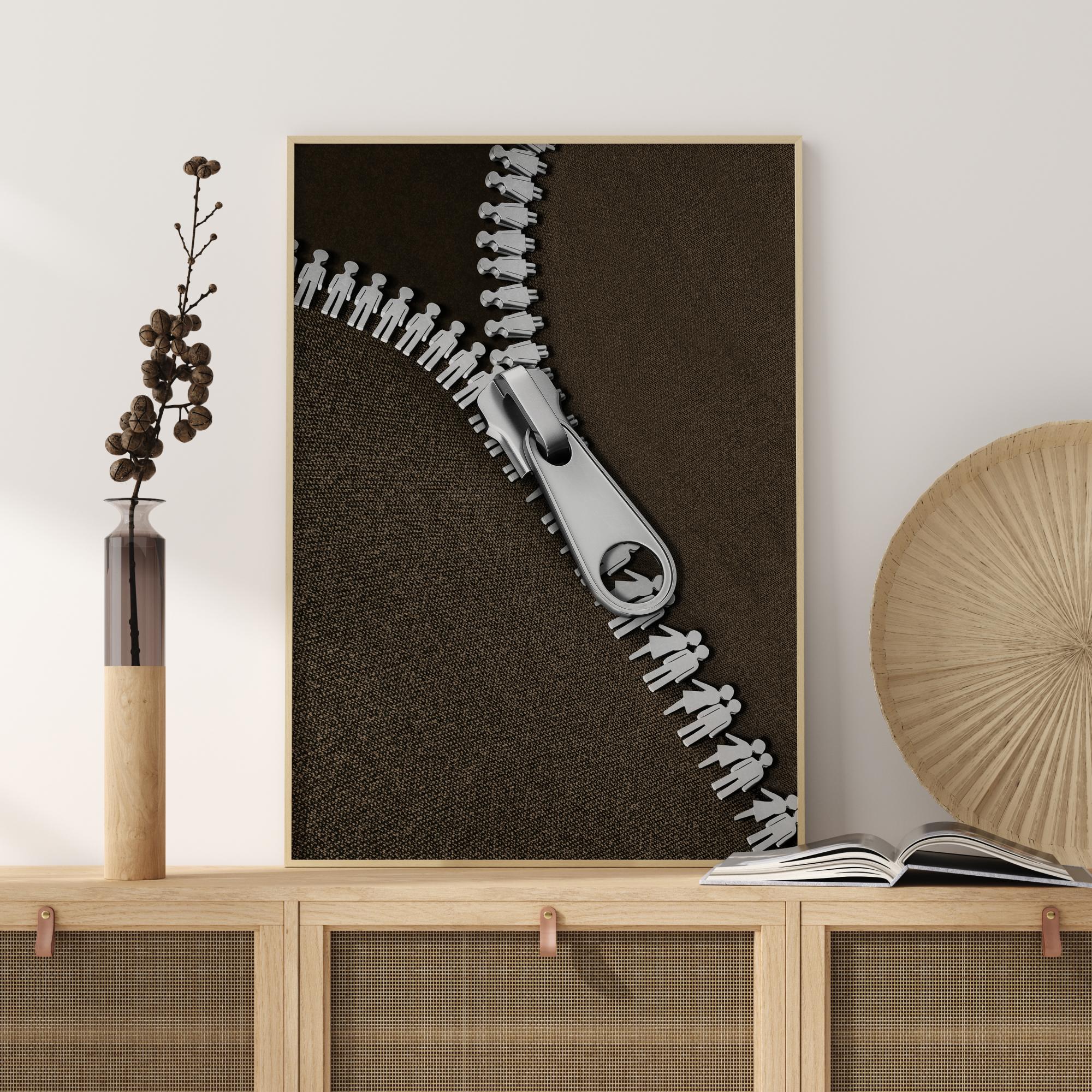 Минималистичен печат на сребрист цип. Сребристият цип върху черен фон изобразява двама влюбени, които се срещат. На тъмнокафява тъкан виси сребристата катарама над фигурите на ципа. Забавен плакат за всички, които се интересуват от мода.